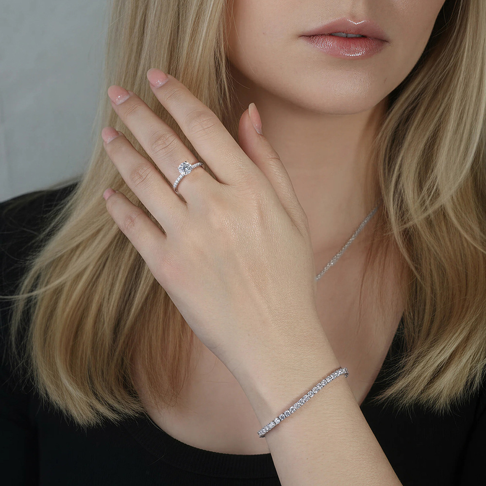 Declare your love with the timeless beauty of our 1 Carat Round Moissanite Pavé Engagement Ring. This classic design features a brilliant 1-carat round-cut Moissanite center stone, securely held by an elegant 4-prong setting to maximize its extraordinary fire and light return. The glamour is further enhanced by a delicate band adorned with shimmering pavé-set stones that draw the eye directly to the center gem. Crafted from polished S925 sterling silver, this ring offers the luxurious look of a traditional diamond engagement ring with enduring quality and breathtaking sparkle.
