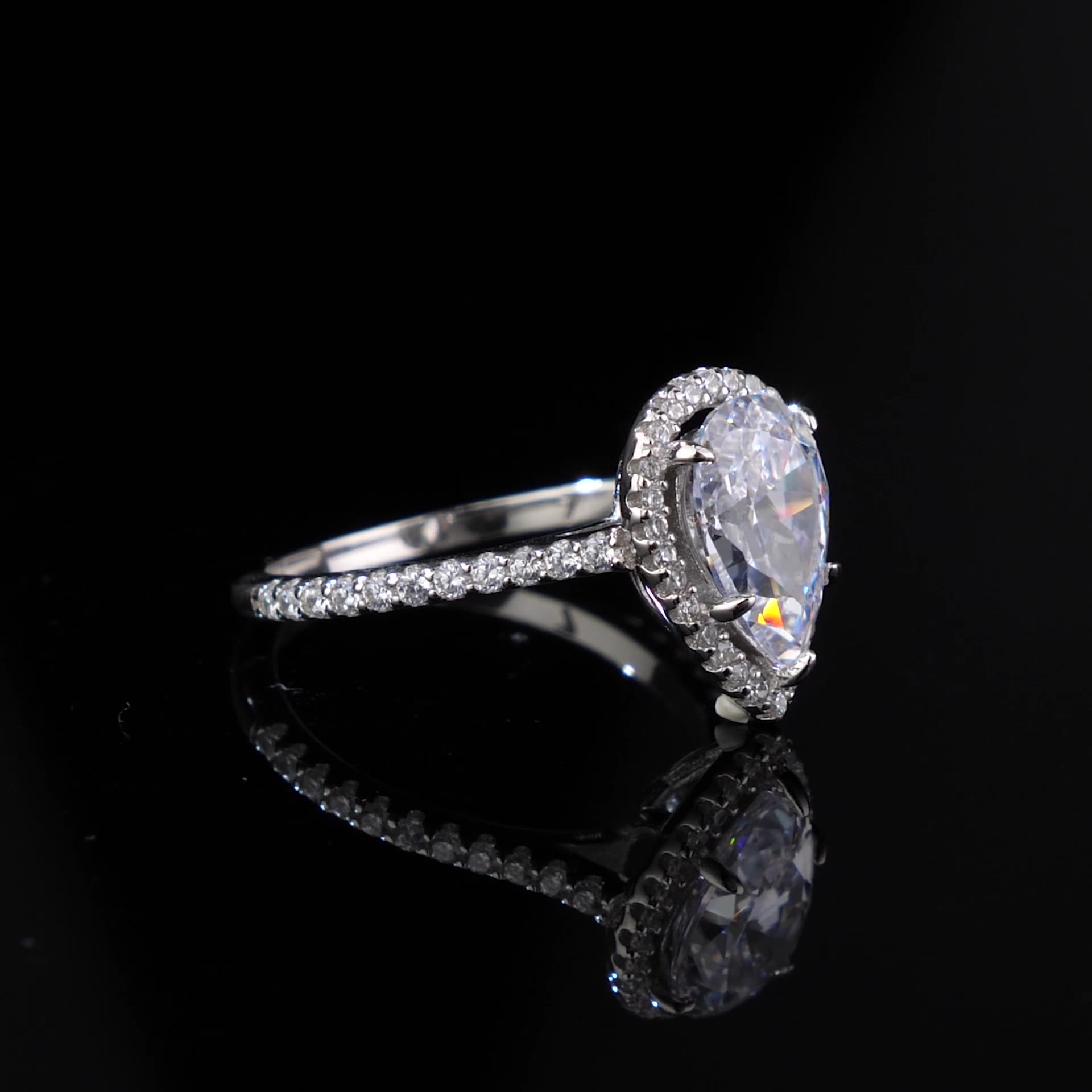 A glamorous best-seller in luxury collections, this 3-carat pear-cut cubic zirconia ring captures the brilliance of fine jewelry at an accessible price. Set in rhodium-plated 925 sterling silver, the halo and pavé band design deliver maximum sparkle and modern sophistication. Ideal for engagement-style jewelry lines, boutique displays, or premium fashion accessories.