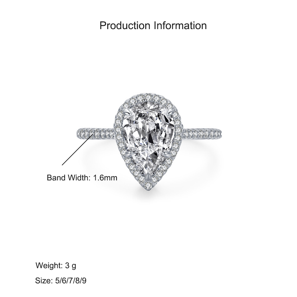 Brilliant and captivating, this 925 sterling silver ring features a dazzling 3-carat pear-cut cubic zirconia surrounded by a shimmering halo of smaller stones. Its "pigeon-egg" size center stone creates a statement look that’s bold yet elegant, while the pavé-set band enhances the ring’s refined sparkle. Crafted from genuine sterling silver and plated in rhodium, it delivers lasting brilliance and a luxurious finish that complements both special occasions and everyday sophistication.