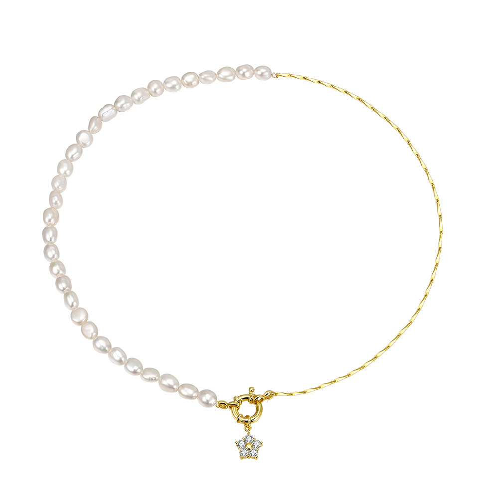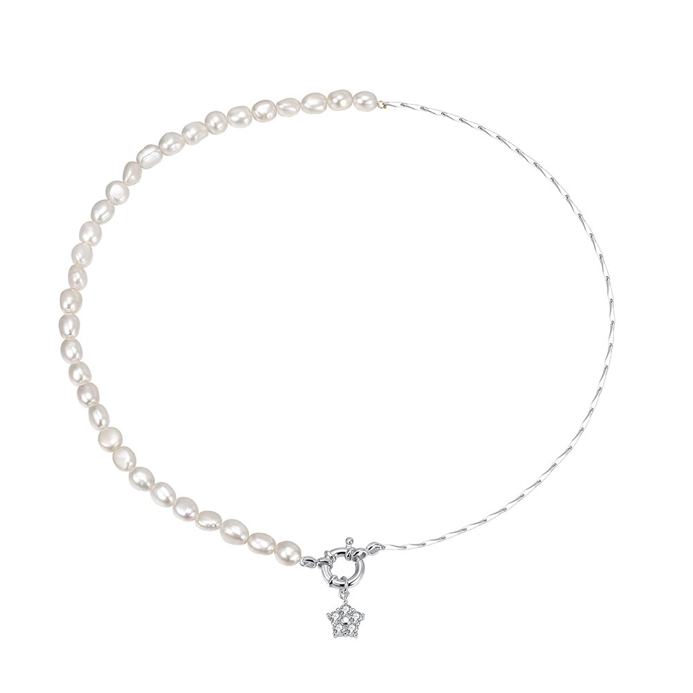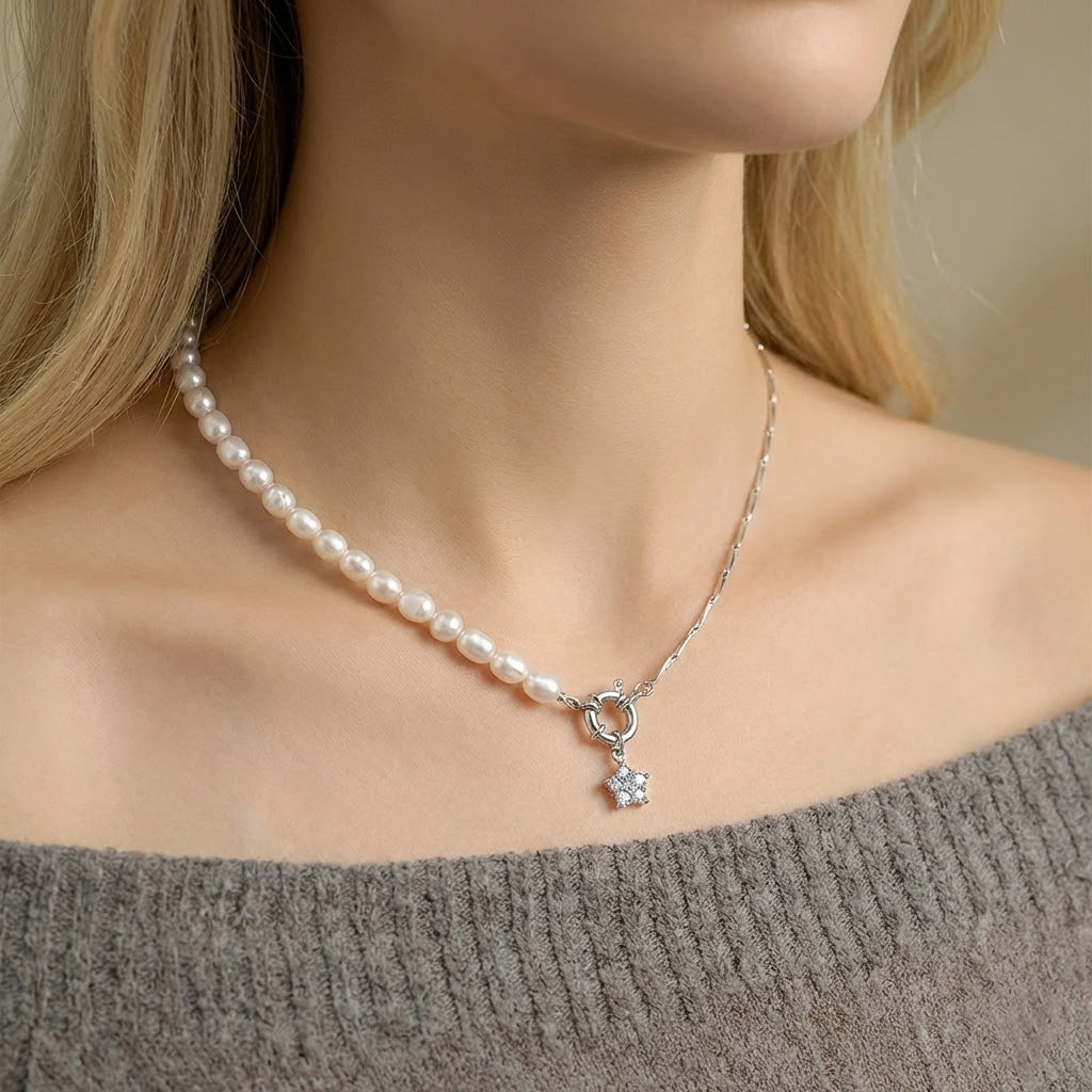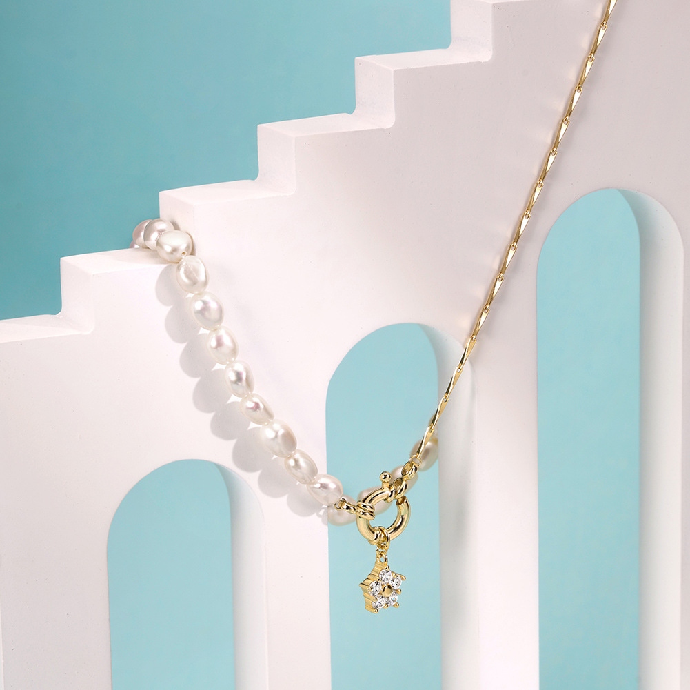 Capture the lucrative "mixed media" and "front-clasp" jewelry trends with our Wholesale 925 Sterling Silver Asymmetrical Pearl Star Pendant Necklace. Consumers are actively seeking dynamic, asymmetrical designs that disrupt traditional jewelry silhouettes. This SKU delivers massive retail appeal by blending high-demand natural freshwater pearls with a contemporary textured chain. The functional, front-facing ring clasp paired with a sparkling star drop pendant adds significant visual interest and a premium designer feel that commands an excellent retail margin. Available in essential silver and yellow-gold platings, this versatile, high-turnover item is an absolute necessity for your "Modern Pearl," "Trendy Essentials," and "Statement Necklace" collections.