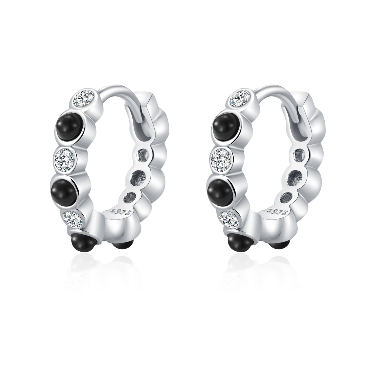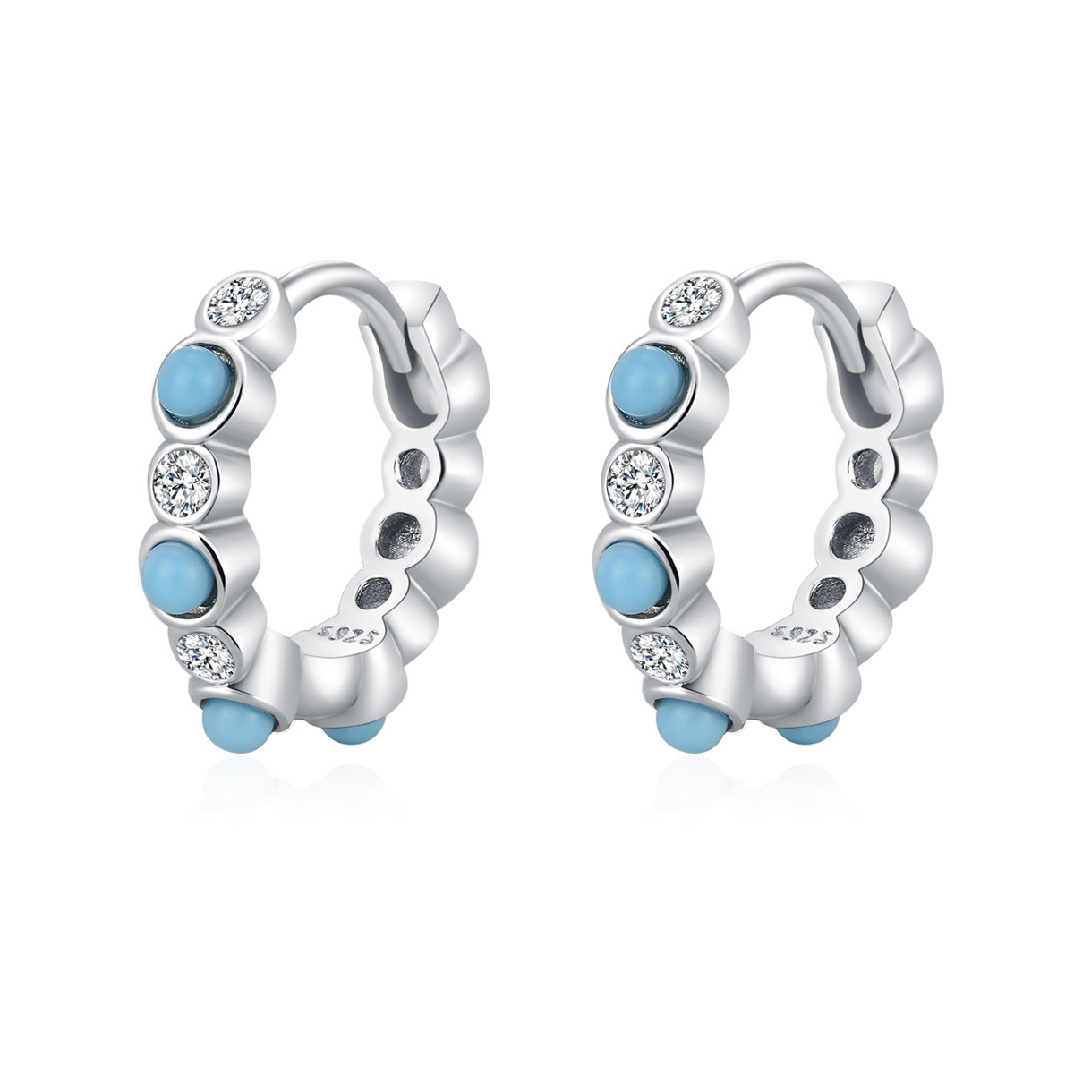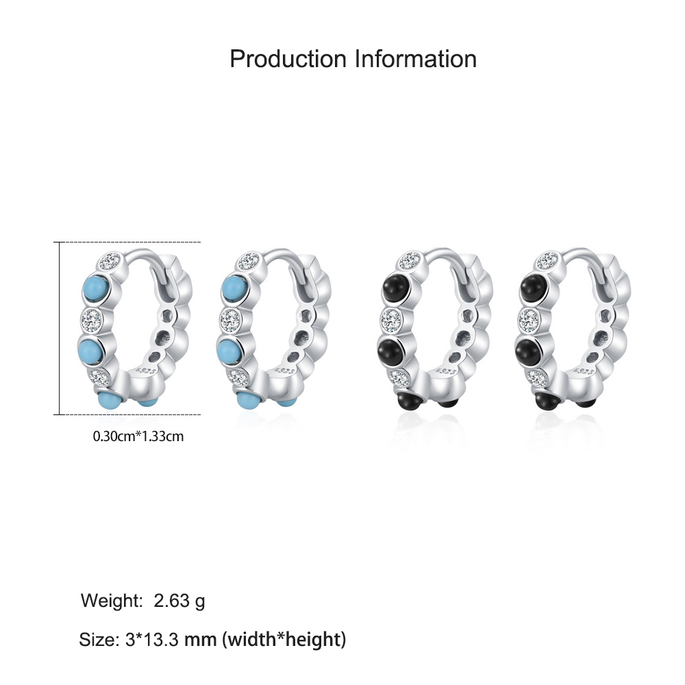 These 925 sterling silver beaded hoop earrings feature alternating round zircon stones and smooth metal beads for a refined yet playful look. The micro-pave detailing adds a touch of sparkle that complements both everyday outfits and evening wear. Available in both turquoise and black variants, these earrings blend elegance with individuality. Crafted from hypoallergenic sterling silver, they ensure lasting shine and comfort for sensitive ears.