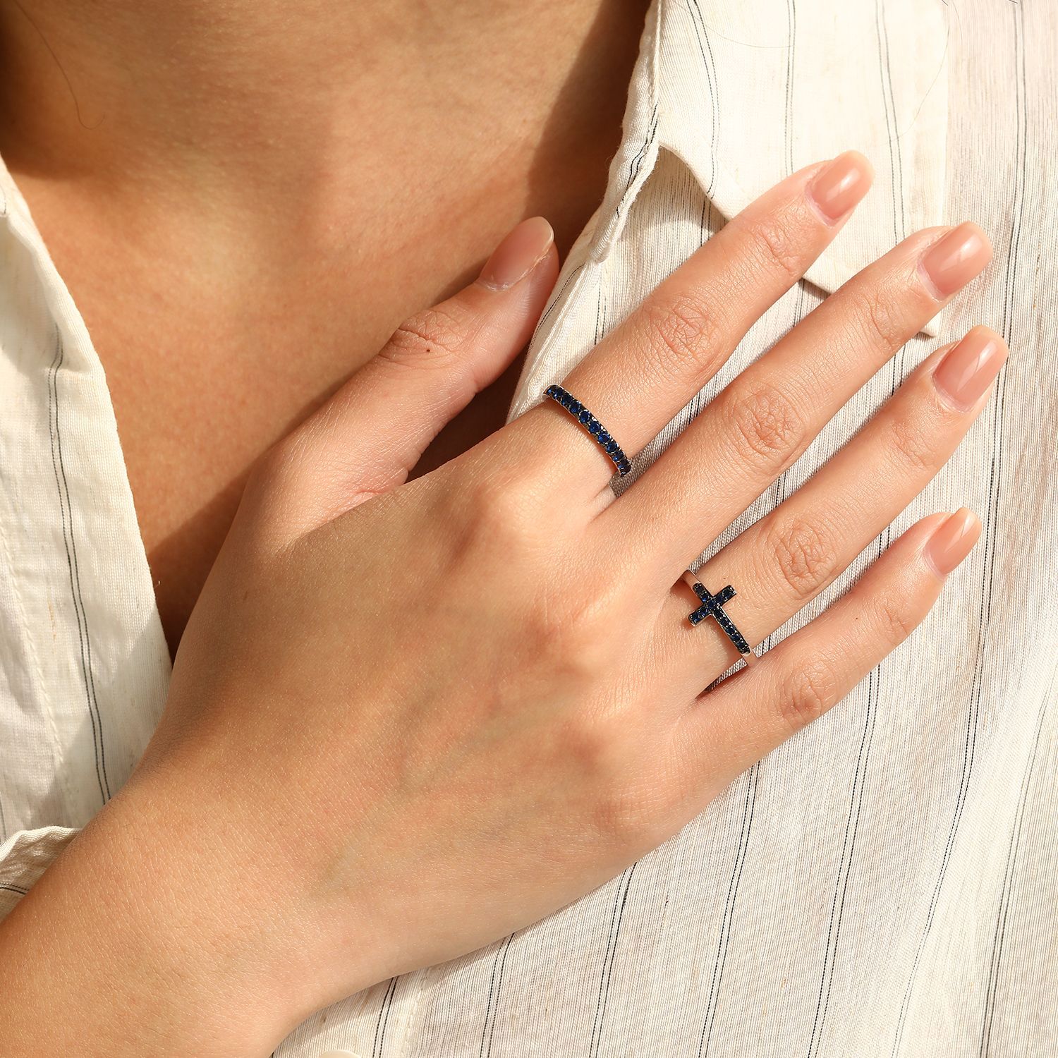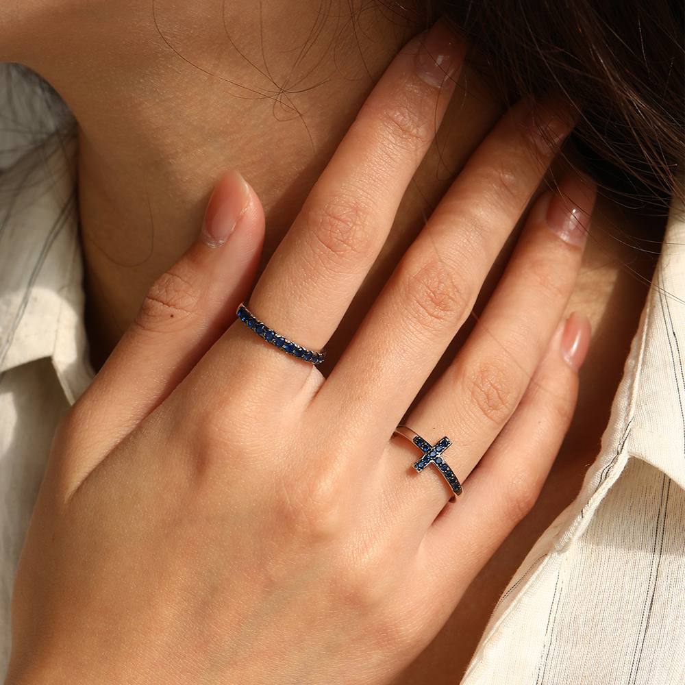 Capitalize on the highly lucrative "ring stacking" trend with our Wholesale 925 Sterling Silver Blue Pave Eternity Ring. Slim pave bands are foundational retail staples, and this SKU adds exceptional visual interest by utilizing vibrant, deep blue stones in a classic vintage-inspired setting. This rich pop of color provides a premium, boutique-quality aesthetic that drastically increases perceived value and supports excellent retail markups. Furthermore, the versatile silhouette makes it a phenomenal cross-selling and up-selling item, beautifully complementing other minimalist pieces in your catalog to instantly increase customer cart sizes. Crafted from hypoallergenic S925 silver, this high-turnover item is a mandatory anchor for your "Everyday Fine Jewelry," "Stacking Essentials," and "Colorful Gems" assortments.