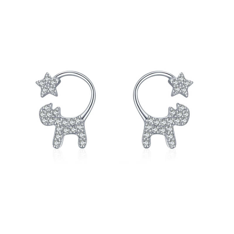 These wholesale 925 sterling silver cat and star earrings feature a delightful design with micro-pavé zircon details, combining playful charm and elegant sparkle. Made from premium sterling silver, they are hypoallergenic and ideal for animal jewelry collections. Perfect for retailers seeking cute, fashionable earrings that appeal to cat enthusiasts and lovers of whimsical jewelry.