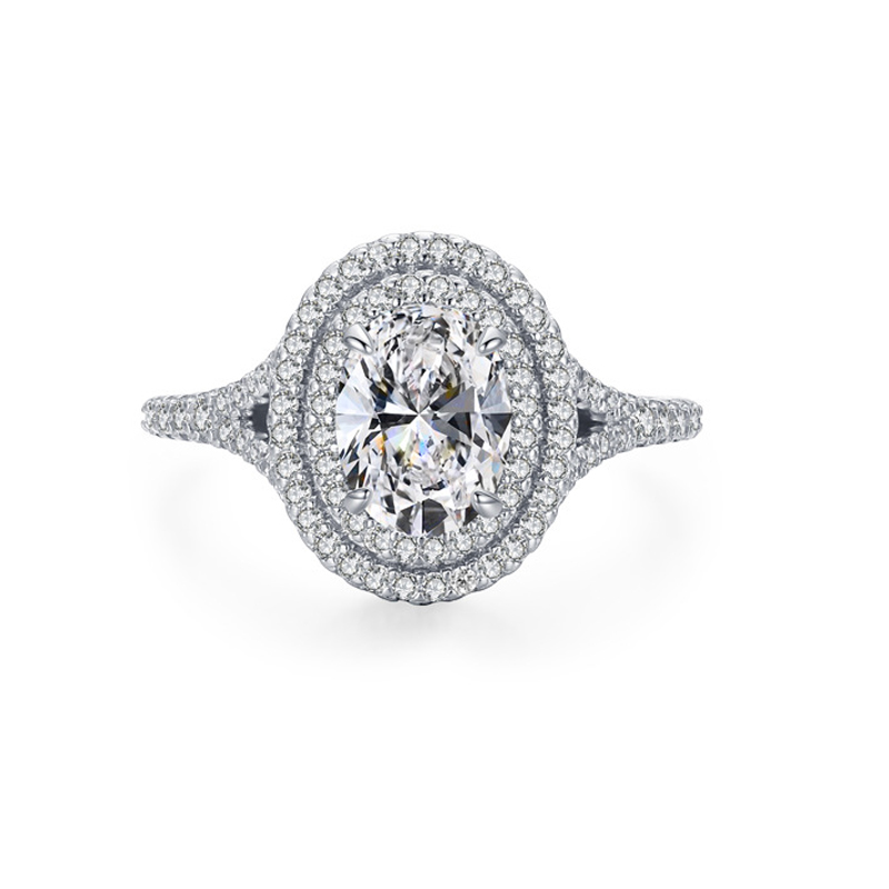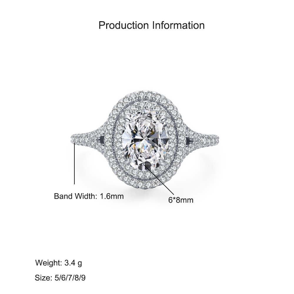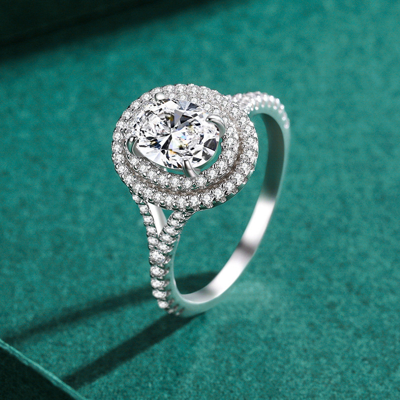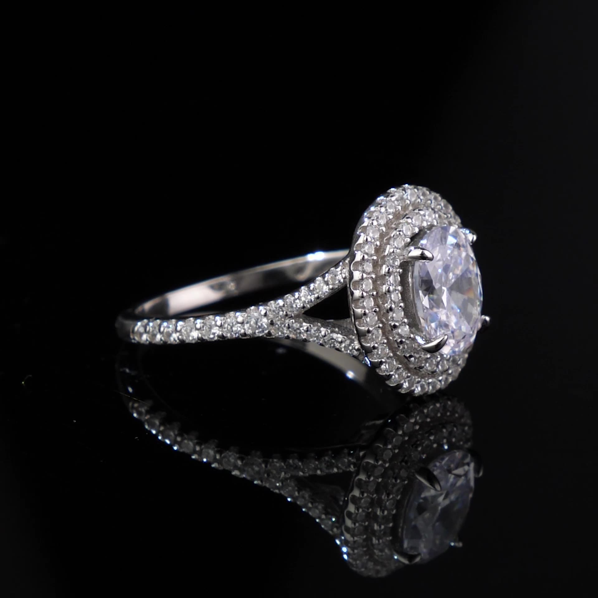 This 925 sterling silver oval CZ ring combines luxury and craftsmanship, featuring a 5-carat center stone framed by a double halo of brilliant cubic zirconia. Designed for high-end appeal, it’s a popular choice for bridal, engagement, and statement jewelry collections. Crafted with rhodium-plated sterling silver for superior shine and durability, this ring adds timeless glamour to any wholesale selection.
