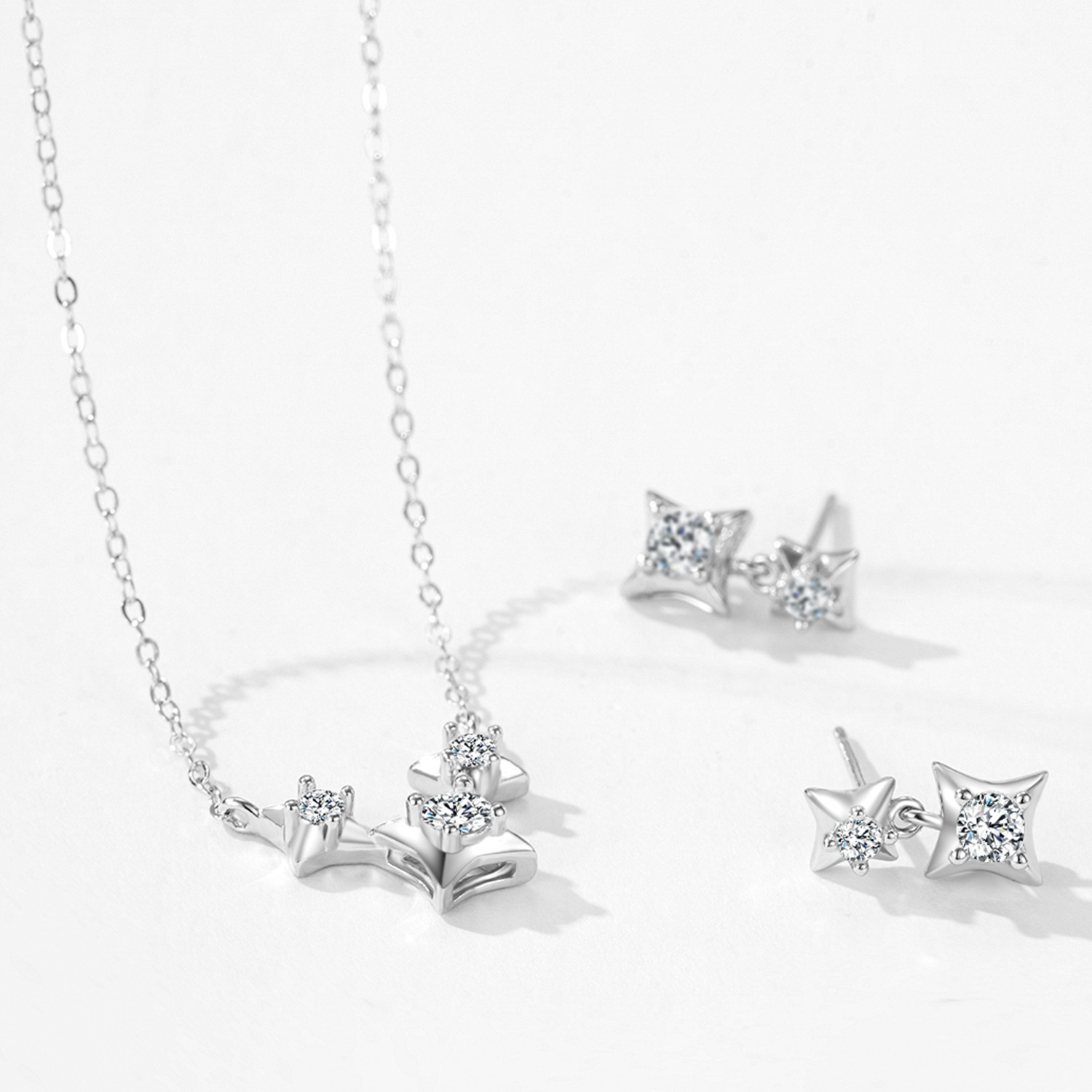 These wholesale 925 sterling silver earrings showcase a refined double-star motif, each set with precision-cut zircons for brilliant shine. The articulated design adds movement and luxury, making them a bestseller for fashion jewelry collections. Ideal for retailers seeking versatile and trendy celestial-inspired pieces that combine elegance and everyday appeal.