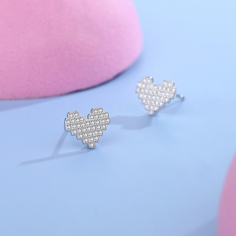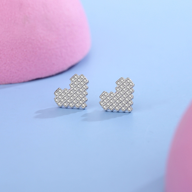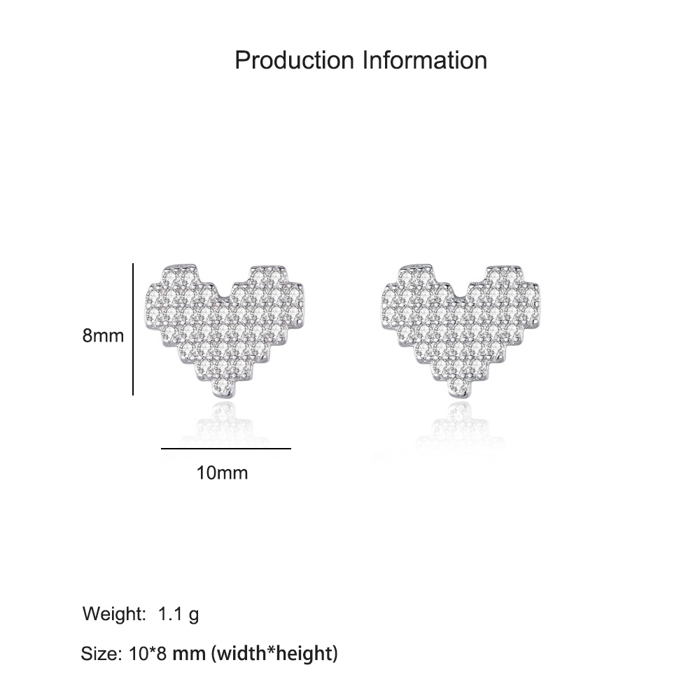These stunning 925 sterling silver earrings feature a pixel-style heart shape fully encrusted with dazzling cubic zirconia. The shimmering pavé design adds a modern romantic touch, perfect for expressing love and individuality. Lightweight yet luxurious, these heart studs are ideal for daily wear, special dates, or as a thoughtful gift for someone you cherish.