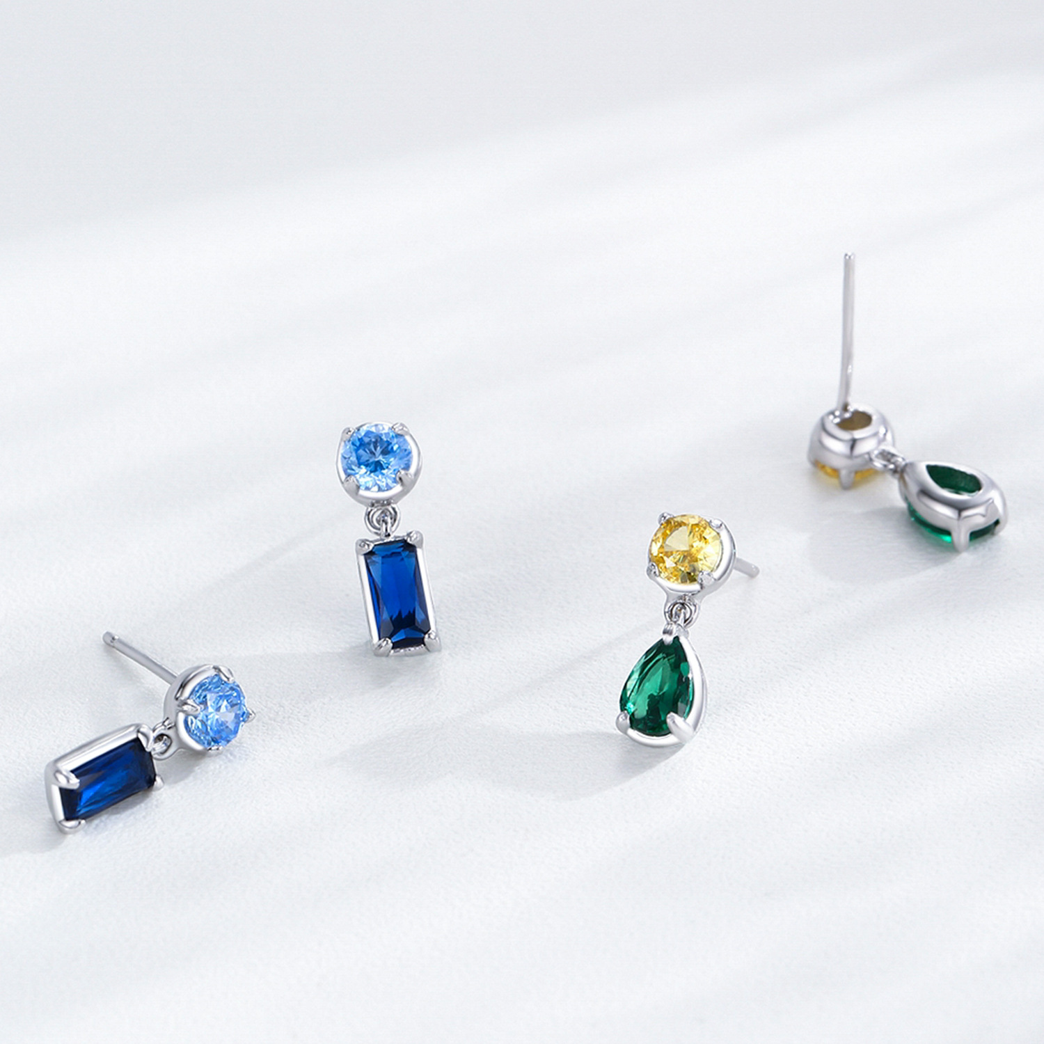 These wholesale 925 sterling silver earrings feature a modern geometric design that blends round and rectangular blue zircon stones. The rich sapphire hue paired with silver tones makes them an attractive addition to any jewelry collection. Ideal for retailers seeking elegant, trend-forward designs that appeal to both classic and modern tastes. Each piece is crafted from high-quality silver with precision-cut zircons for exceptional brilliance.