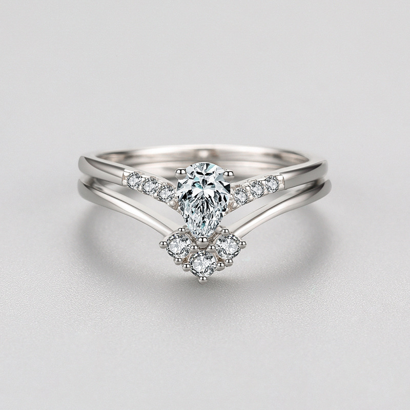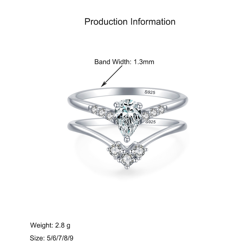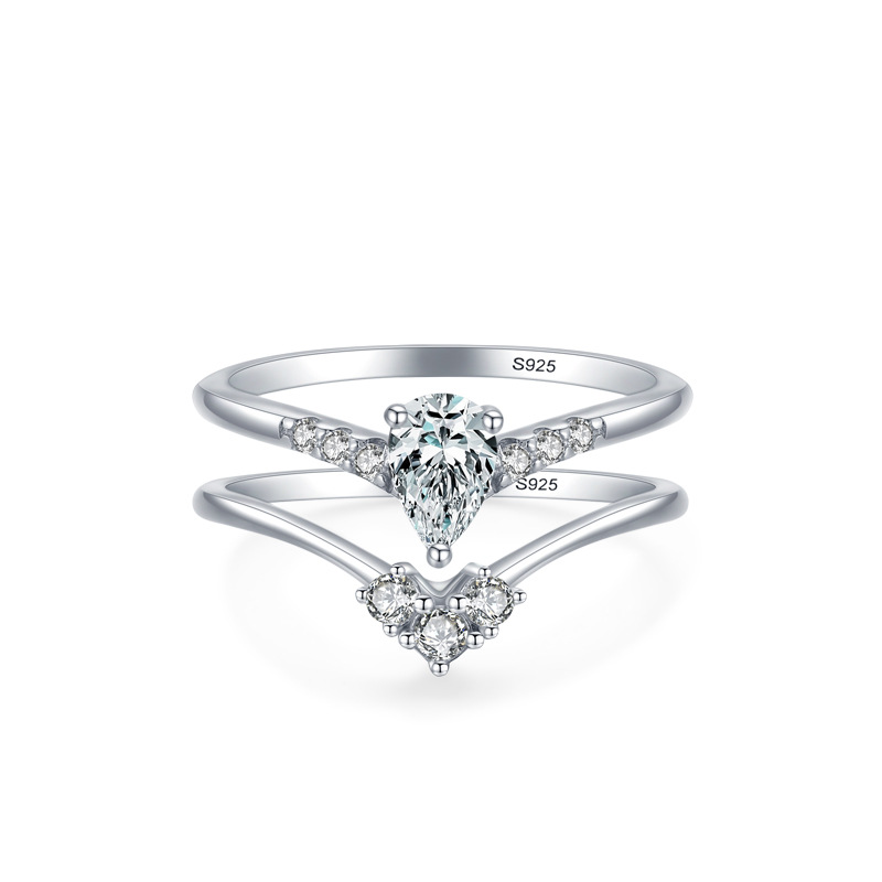 A refined combination of sparkle and style, this two-piece ring set features a pear-shaped cubic zirconia ring paired with a graceful V-shaped accent band. Crafted from genuine 925 sterling silver and finished with a mirror-like rhodium polish, it radiates modern elegance. Wear the rings stacked together for a layered statement look or separately for minimalist charm. Perfect for daily wear, anniversaries, or as a promise ring.
