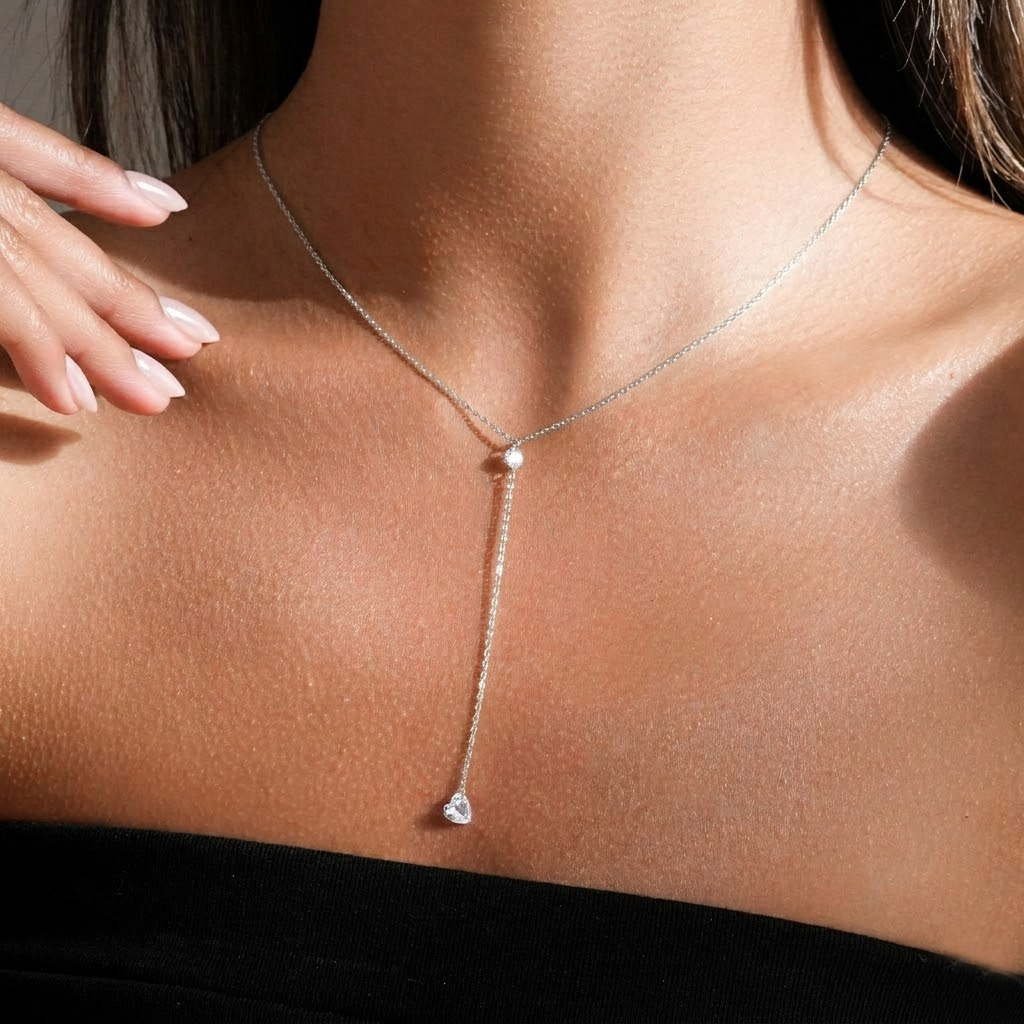 Drive high-volume, repeat sales with our Wholesale 925 Sterling Silver Heart Y-Lariat Tassel Necklace. Minimalist "Y" and lariat-style silhouettes are foundational retail staples, highly requested for modern layering and versatile everyday wear. This SKU delivers exceptional value with a delicate chain featuring a brilliant-cut accent stone and an intricate heart-cut crystal drop. The adjustable chain ensures broad appeal and minimizes returns. Crafted from hypoallergenic S925 silver, this premium boutique aesthetic supports excellent retail markups for your "Everyday Staples" and "Minimalist Essentials" assortments.