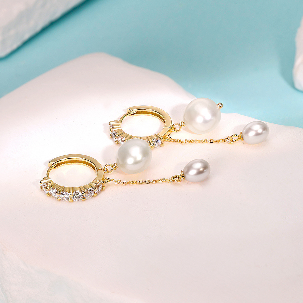 Capture the lucrative special-occasion and bridal markets with our Wholesale 925 Sterling Silver Long Pearl Tassel Drop Earrings. Linear, elongating drop earrings are a massive driver in the statement jewelry category, and this SKU executes the trend flawlessly by combining a highly desirable sparkling pavé hoop with a delicate chain and dual freshwater pearls. This combination creates an upscale, designer aesthetic that commands an excellent retail margin while offering your customers beautiful, highly photogenic movement when worn. The secure hinged huggie closure is a highly requested feature that minimizes lost backings and customer returns. Available in essential silver and yellow-gold platings, this premium item is a guaranteed anchor for your "Bridal Collections," "Evening Wear," and "Statement Pearl" assortments.
