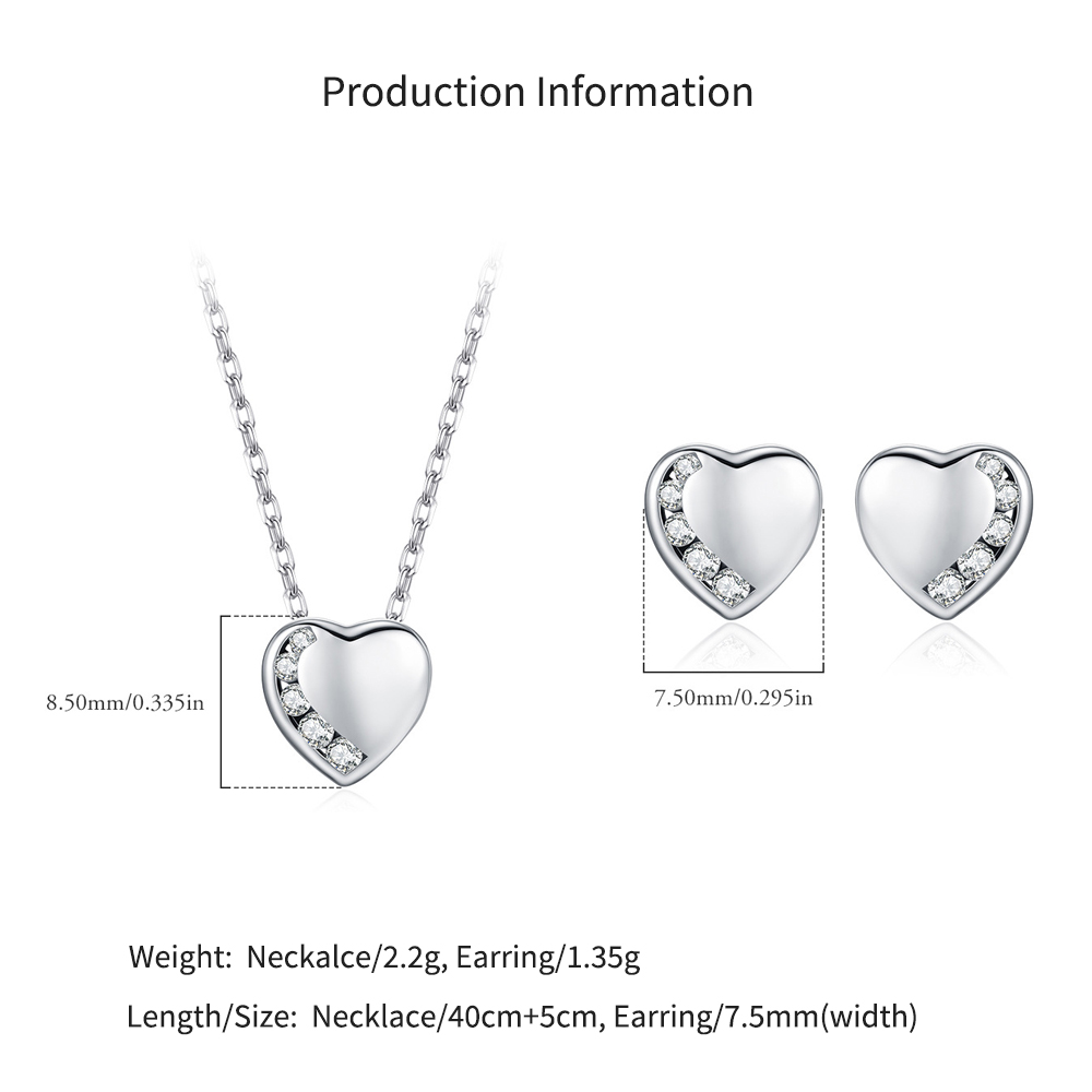 925 Sterling Silver Love Heart Pave Stud Earring Necklace Set 140200014