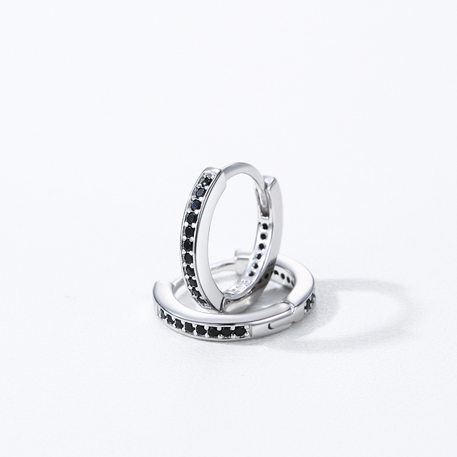 These 925 sterling silver black CZ hoop earrings offer a refined geometric look that is both trendy and timeless. Designed with precision micro-pavé black cubic zirconia, they are a versatile piece ideal for both men's and women's jewelry collections. Perfect for boutique retailers and online stores seeking minimalist luxury with urban appeal. Available in rhodium-plated finish to ensure long-lasting brilliance and anti-tarnish protection.