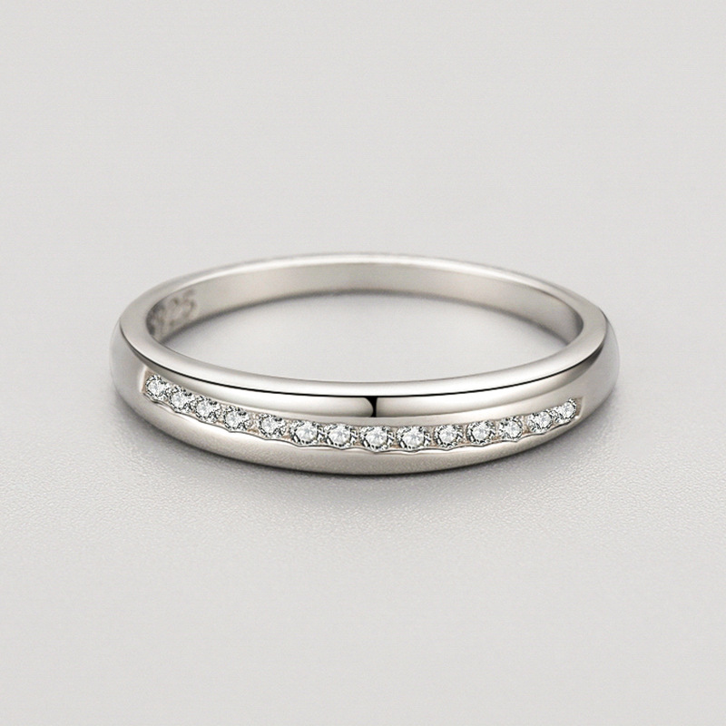 Sleek and refined, this 925 sterling silver ring features a clean geometric design with a row of micro-pavé cubic zirconia stones embedded in a polished channel setting. The minimalist style exudes understated sophistication, making it perfect for both everyday wear and special occasions. The rhodium-plated finish offers a lasting shine and prevents tarnishing, while the smooth band ensures comfortable, long-term wear.