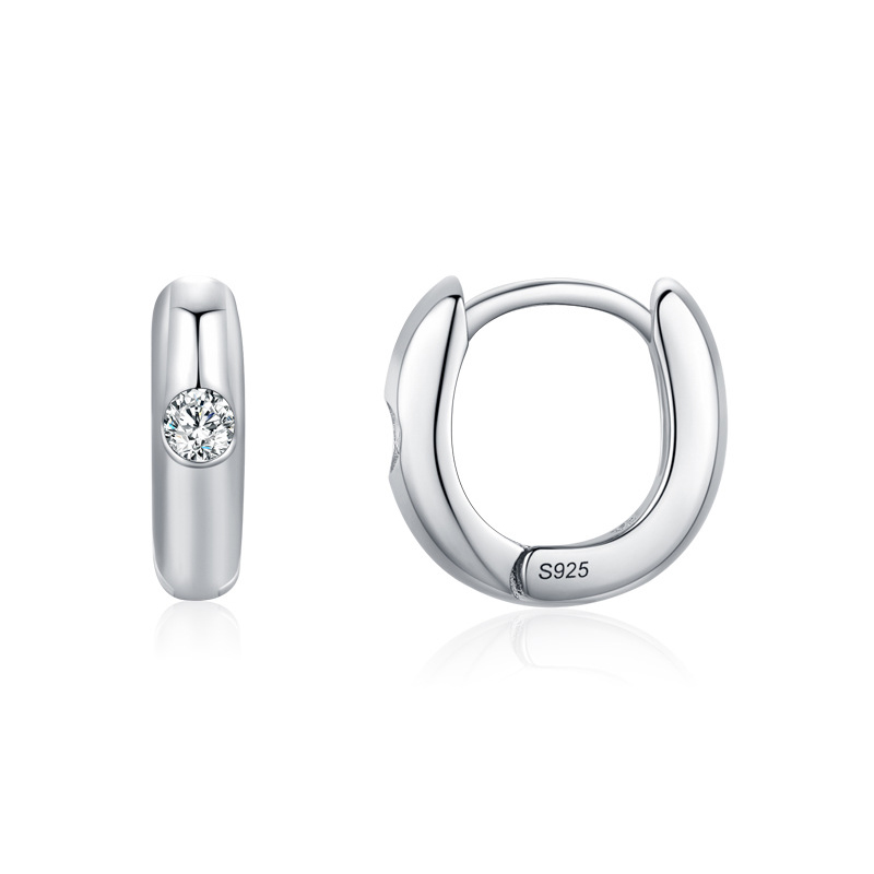 These wholesale 925 sterling silver hoop earrings showcase a minimalist geometric shape with a single embedded zircon for subtle brilliance. Designed for modern jewelry collections, they appeal to customers who love simplicity with sophistication. Each pair is made of genuine sterling silver with a smooth, high-polish finish, ideal for resellers and boutiques seeking classic pieces with contemporary charm.