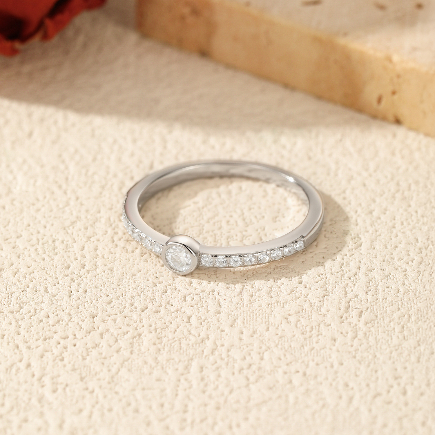 Stock the ultimate "Everyday Essential" with our Wholesale 925 Sterling Silver Moissanite Bezel Pave Ring. The "Bubble" or bezel setting is a top choice for daily wear because it protects the stone and prevents snagging on clothing, appealing to practical yet stylish consumers. This SKU elevates the simple solitaire by adding a row of pavé accents along the shank, increasing the perceived value while maintaining a minimalist aesthetic. It is a versatile performer, perfect for "Stackable Rings," "Promise Rings," or "Gifts under $50" categories.