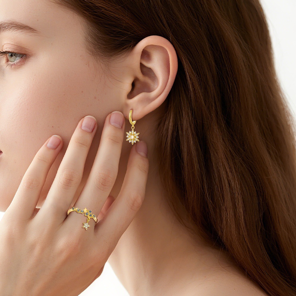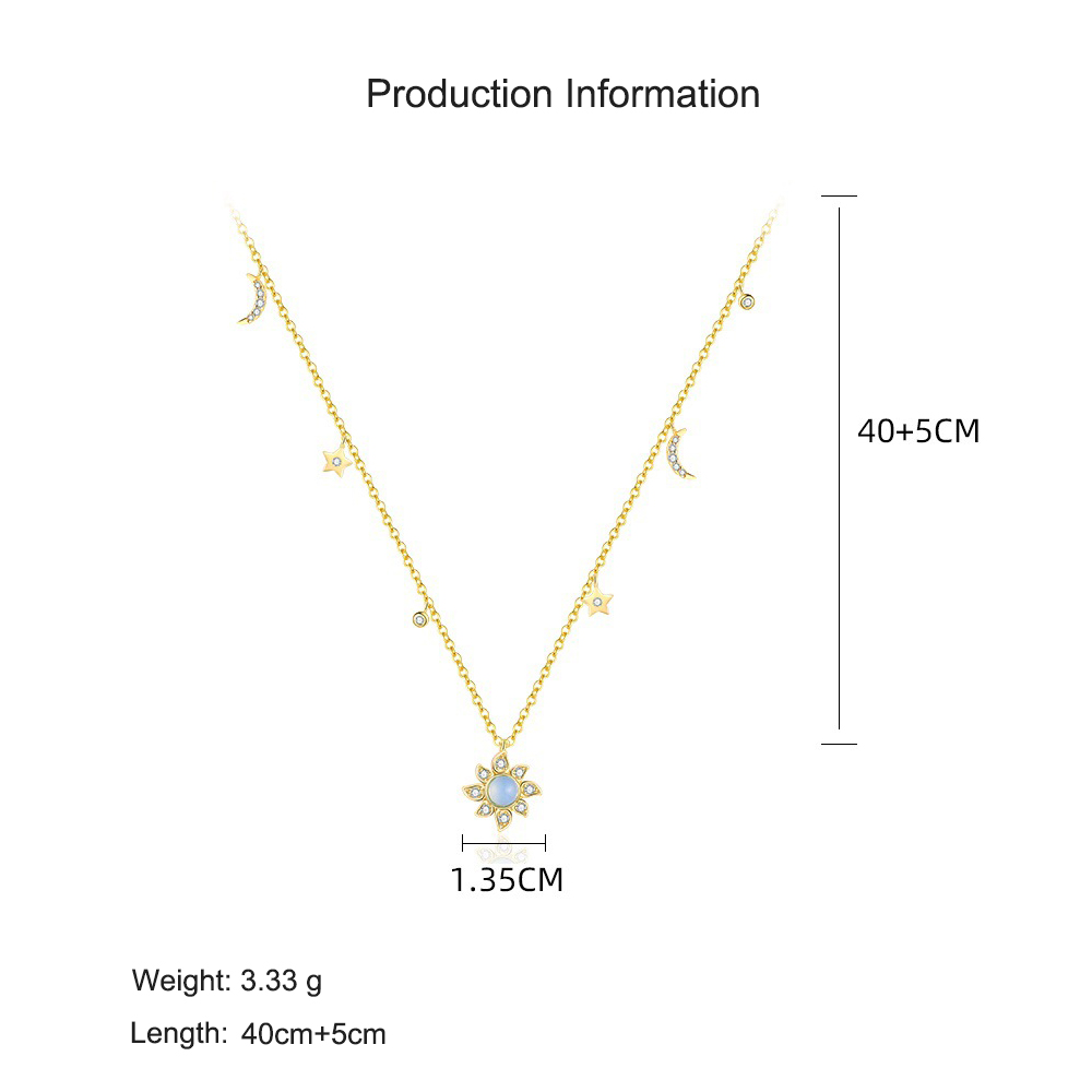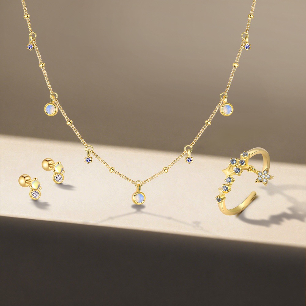 Capitalize on the evergreen "Celestial/Galaxy" trend with our Wholesale925 Sterling Silver Moonstone Star Necklace Earring Ring Set . This comprehensive SKU offers high retail value by combining multiple best-selling elements: a "Layered"necklace with "Sun, Moon, and Star" motifs, paired with both stud and drop earrings and an open ring. The use of "Synthetic Moonstone" provides a high-end iridescent look at an accessible price point. Manufactured from solid S925 sterling silver, this set is designed to drive higher Average Order Value (AOV) through bundled sales.