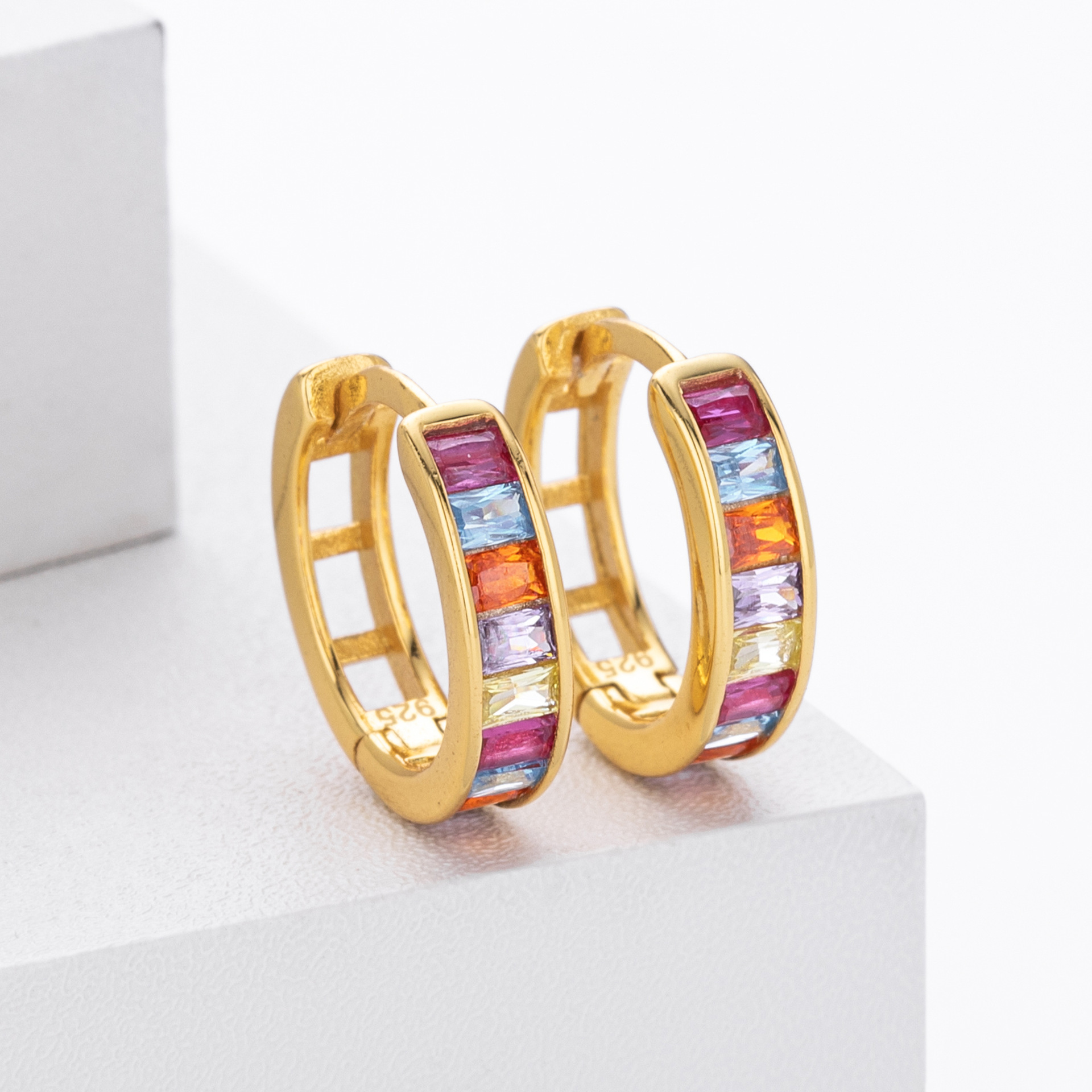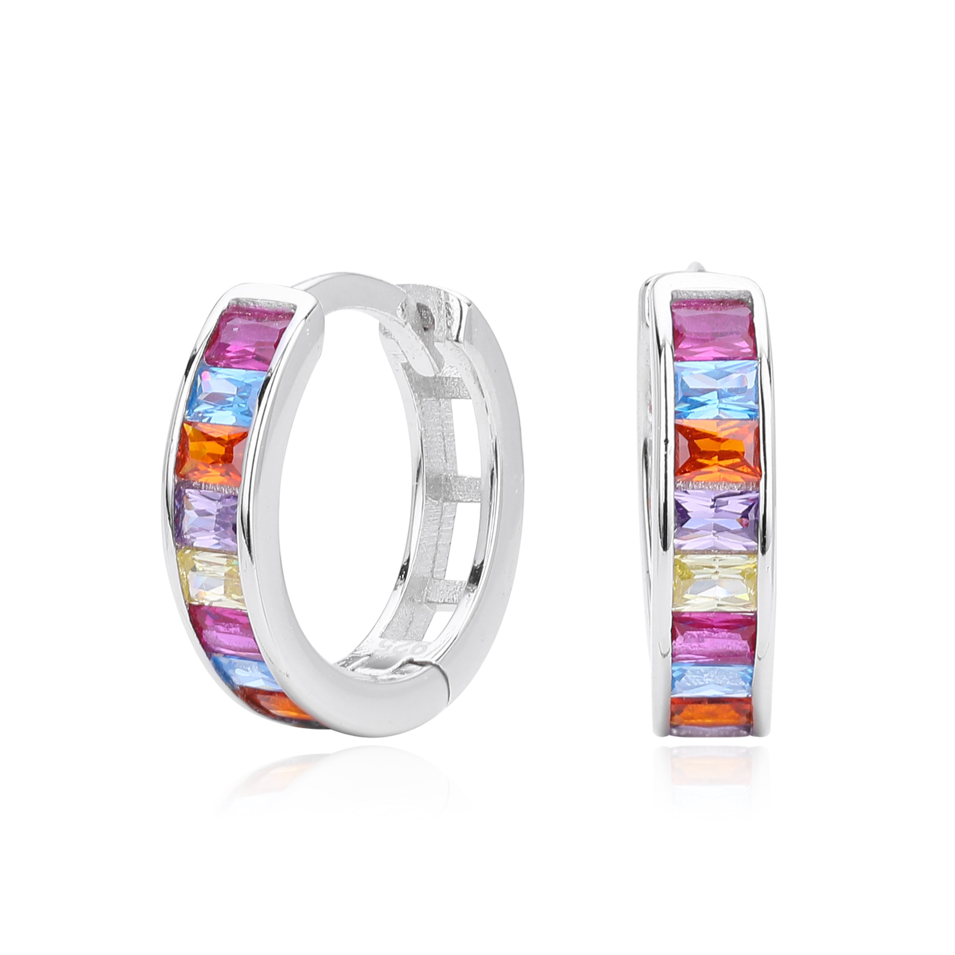 Capitalize on the "Dopamine Dressing" and colorful jewelry trends with our Wholesale 925 Sterling Silver Multi-Color Channel Set Hoops. This SKU features high-quality "Baguette Cut" multi-color Cubic Zirconia in a "Channel Setting," a technique that protects the stones and offers a modern, streamlined profile. The rainbow gradient appeals to younger demographics and is a staple for spring/summer or festival collections. Manufactured from solid S925 sterling silver with a hollowed inner gallery for lightweight comfort, these hoops are a high-margin, trend-focused essential.