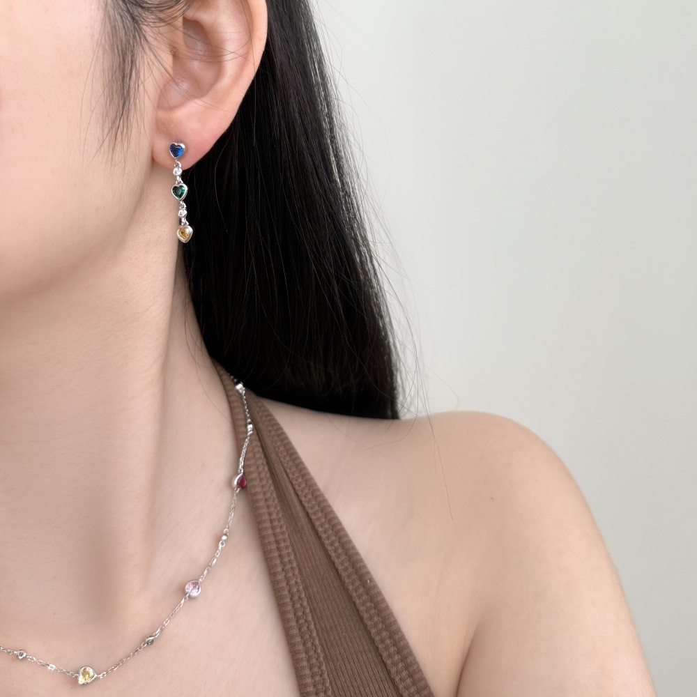 Capitalize on the highly profitable "dopamine dressing" and colorful jewelry trends with our Wholesale 925 Silver Multi-Color Heart Drop Earrings. Linear silhouettes and multi-stone colored designs are massive seasonal retail drivers. This SKU features a beautifully articulated drop of bezel-set heart crystals in vibrant blue, green, and yellow, separated by brilliant clear round accents. Crafted from hypoallergenic S925 silver with secure push-back closures, they deliver exceptional boutique-level perceived value and eye-catching movement. A fast-turning, high-margin anchor for your "Colorful Gems" and "Spring/Summer Essentials" assortments.