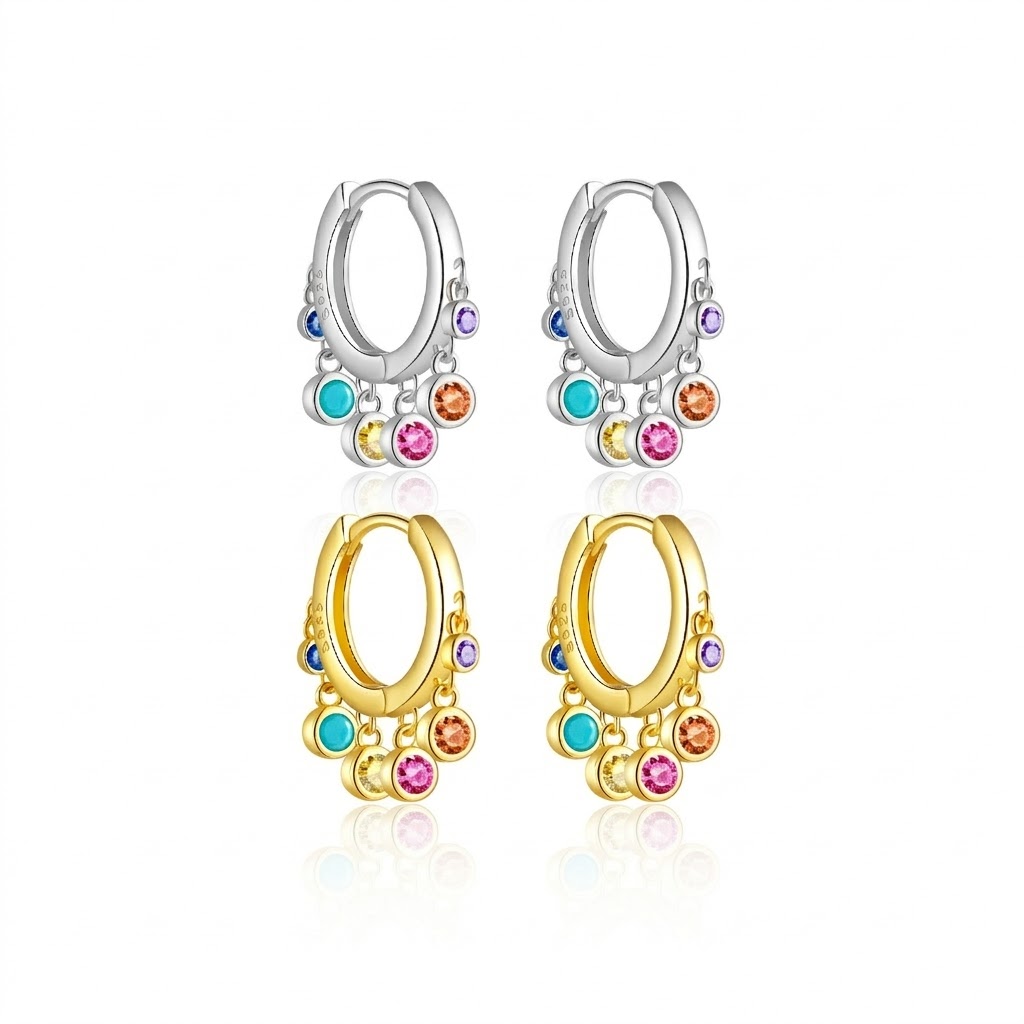 Double down on the "dopamine dressing" trend with our Wholesale 925 Sterling Silver Multi-Color Charm Hoops. Colorful, kinetic jewelry is a proven retail winner. This SKU features a commercial huggie profile adorned with playful, bezel-set colorful zircon drops. Available in highly requested silver and gold finishes, these hypoallergenic S925 earrings offer exceptional movement and boutique-level perceived value. A high-margin, fast-turning must-have for your "Spring/Summer Collections," "Festival Jewelry," and "Colorful Gems" categories.