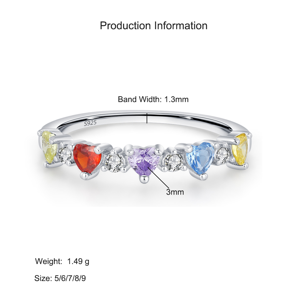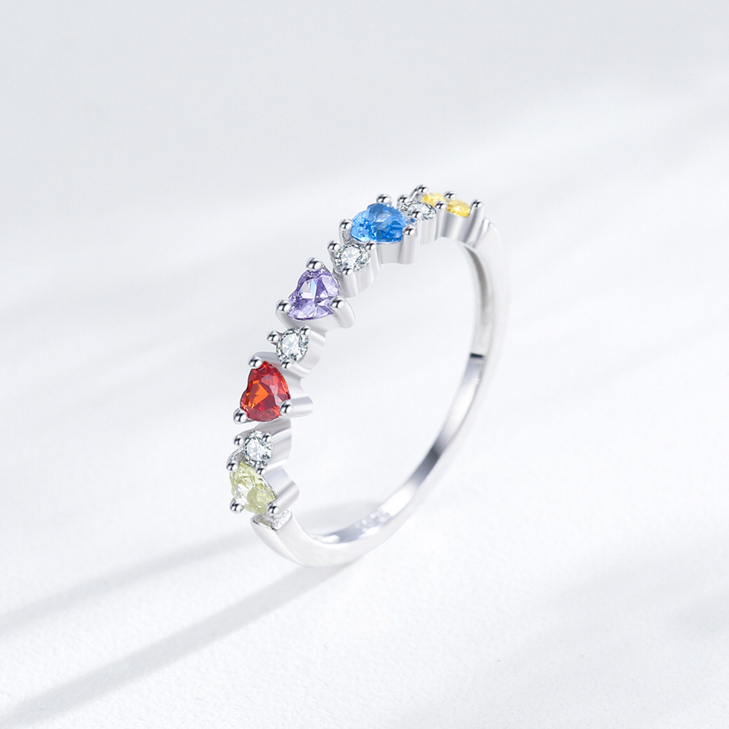 Celebrate love and color with this exquisite 925 sterling silver multicolor heart zircon ring. Featuring a row of vibrant heart-shaped stones in rainbow hues, this ring radiates warmth, joy, and individuality. The polished sterling silver band enhances the brilliance of each stone, making it perfect for daily wear or as a heartfelt gift. Whether symbolizing love, friendship, or positivity, this colorful piece adds a playful yet elegant touch to any outfit. A charming design for those who adore romantic and creative jewelry styles.