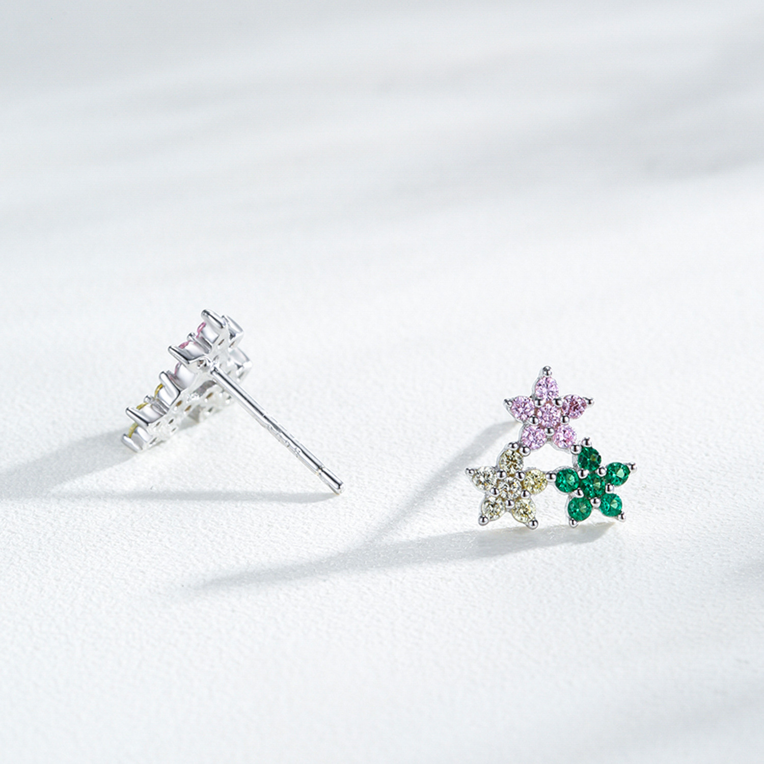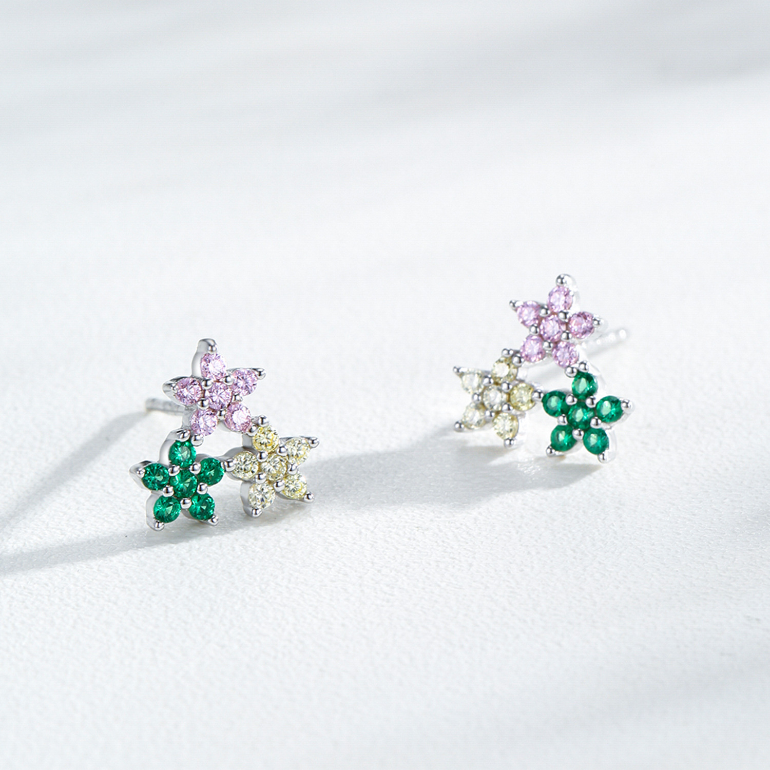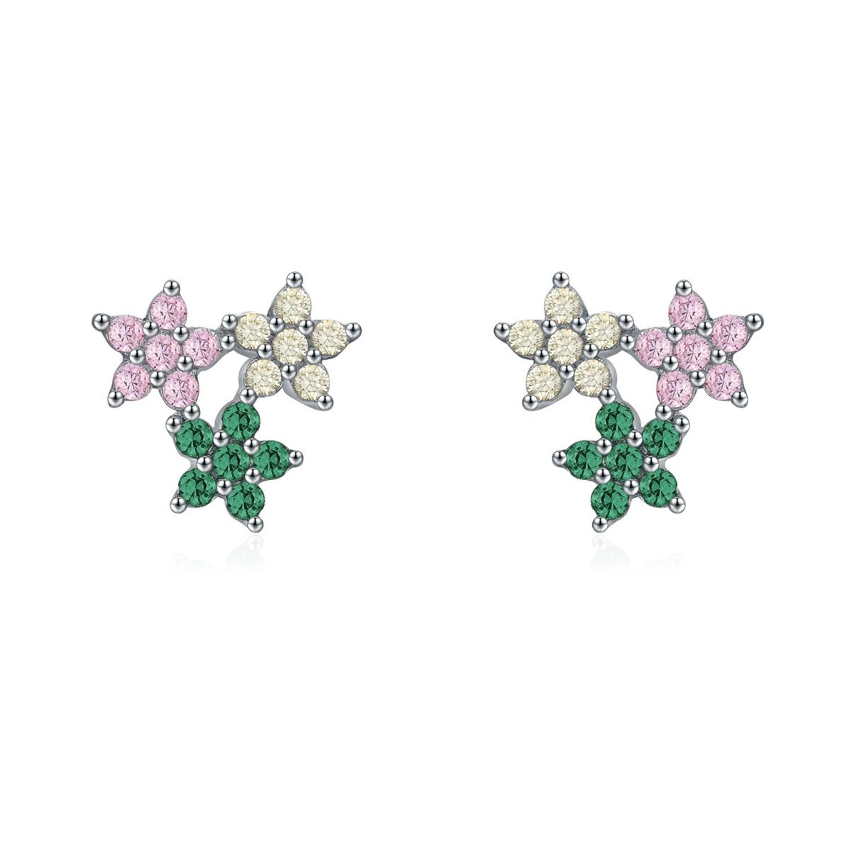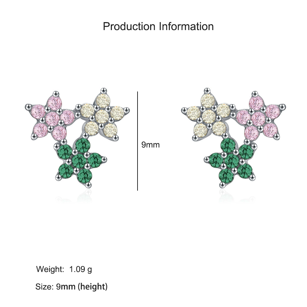 These 925 sterling silver multicolor flower earrings bring a touch of springtime charm to your everyday look. Each stud features clusters of shimmering pink, green, and champagne zircon stones arranged in delicate floral shapes, radiating elegance and color from every angle. Crafted with hypoallergenic sterling silver, these earrings are lightweight, comfortable, and perfect for daily wear or special occasions. A delightful accessory that blends femininity with modern sparkle.