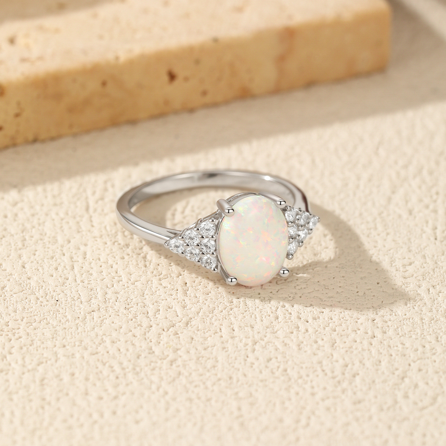 Stock the timeless appeal of our Wholesale 925 Sterling Silver Oval Created Opal Ring. The "Oval Cut" is a classic shape that elongates the finger, making it a perennial favorite in ring assortments. This SKU features a high-quality "Created White Opal" center, accented by pave-set cubic zirconia side clusters for added perceived value. It serves as an excellent price-point alternative to natural opal rings, perfect for "October Birthstone" promotions or "Promise Ring" categories.