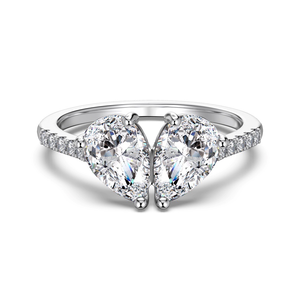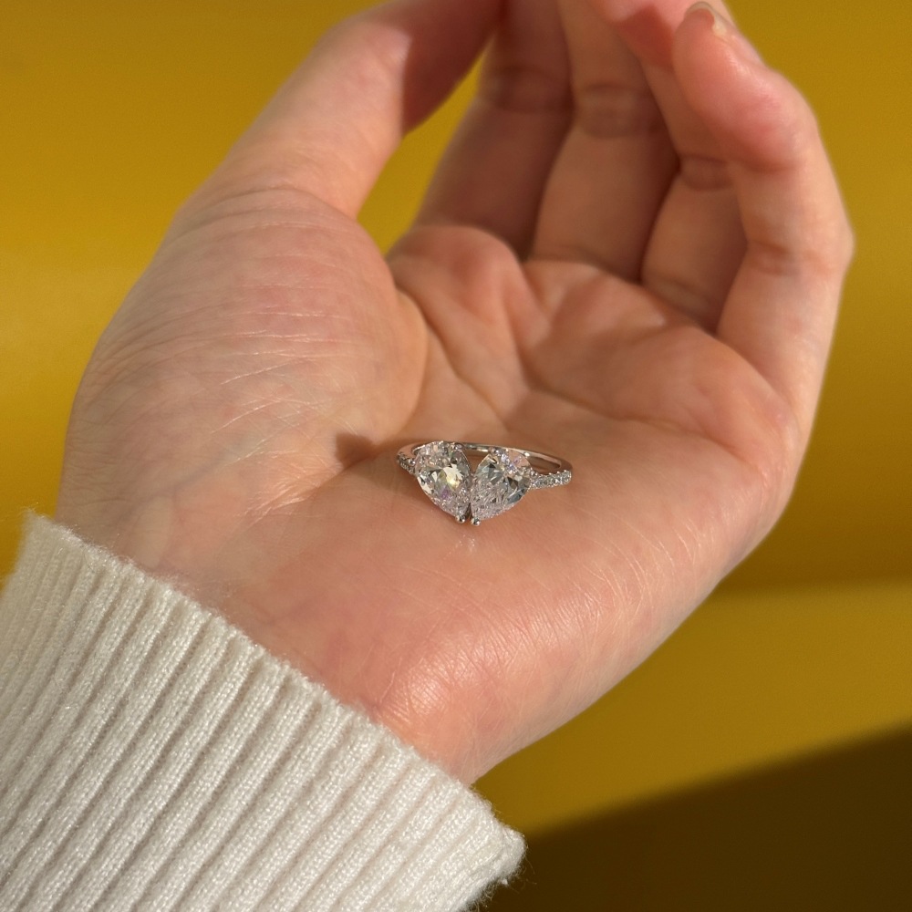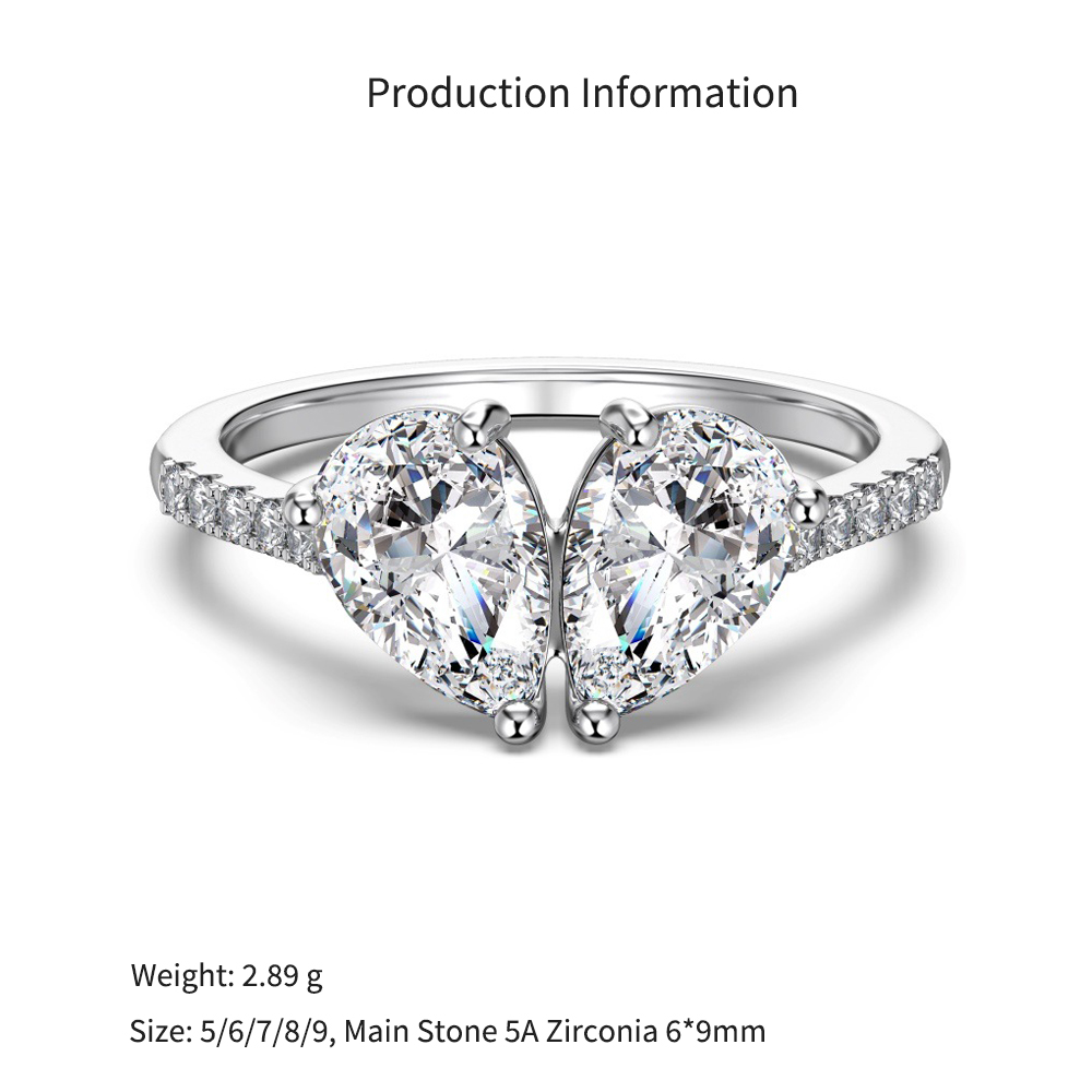 Elevate your high-end inventory with our wholesale-exclusive spliced pear-cut ring. The "Toi et Moi" two-stone silhouette is a massive retail driver, and this design innovates by nesting two brilliant pear-cut crystals into a seamless butterfly or split-heart shape. Set atop a delicate band lined with sparkling micro-pave accents, this piece maximizes light return and perceived carat size. Crafted from hypoallergenic S925 silver, it delivers incredible fine-jewelry-level craftsmanship at competitive bulk pricing. A mandatory, high-margin anchor for your bridal alternative, romantic gifting, and luxury statement assortments.