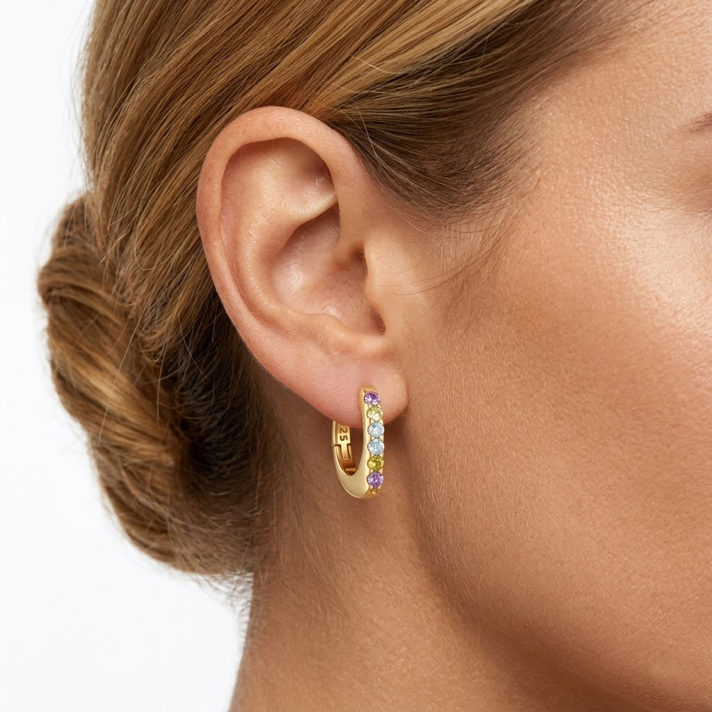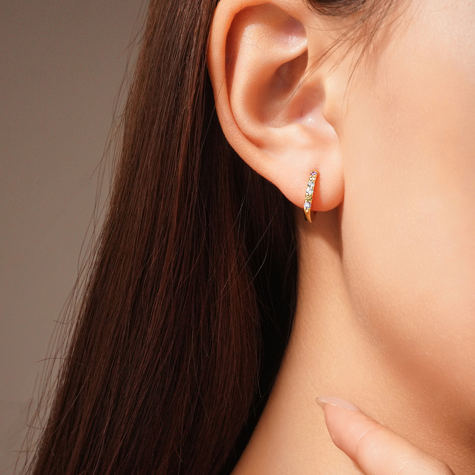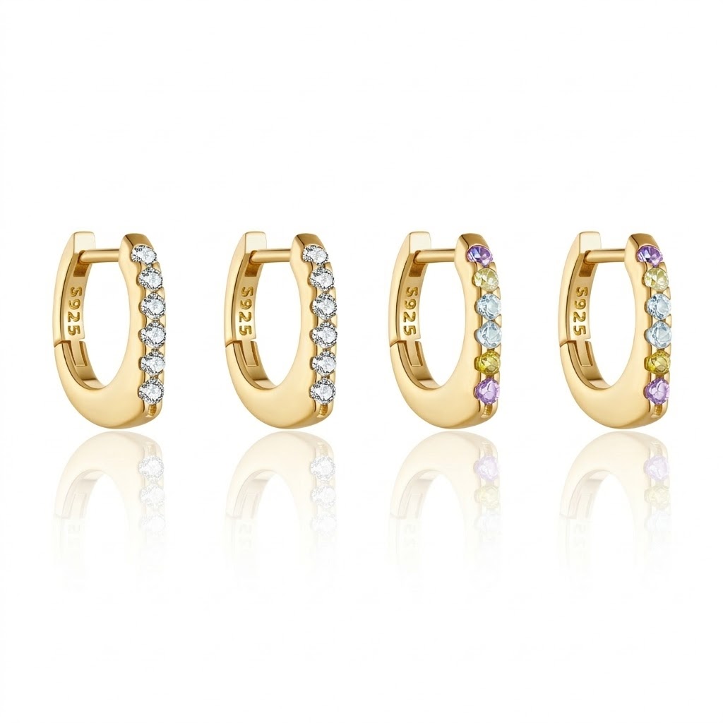 Drive consistent volume with our Wholesale 925 Sterling Silver Pave Huggie Hoops. Dainty, click-in huggies are absolute essentials for the highly lucrative ear-stacking market. This SKU offers maximum merchandising flexibility, featuring sleek U-shaped hoops paved with either classic clear crystals in gold and silver, or trendy pastel stones in gold. Crafted from hypoallergenic S925 silver, these secure, snug-fitting earrings deliver boutique-quality comfort. They are a high-turnover, mandatory anchor for your "Everyday Essentials," "Ear Stacking," and "Minimalist Jewelry" categories.