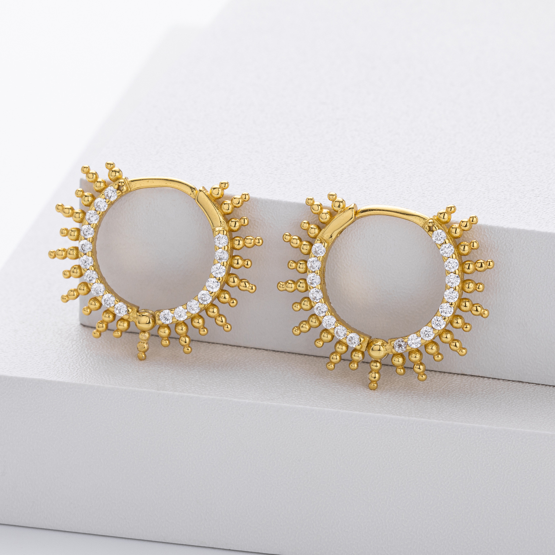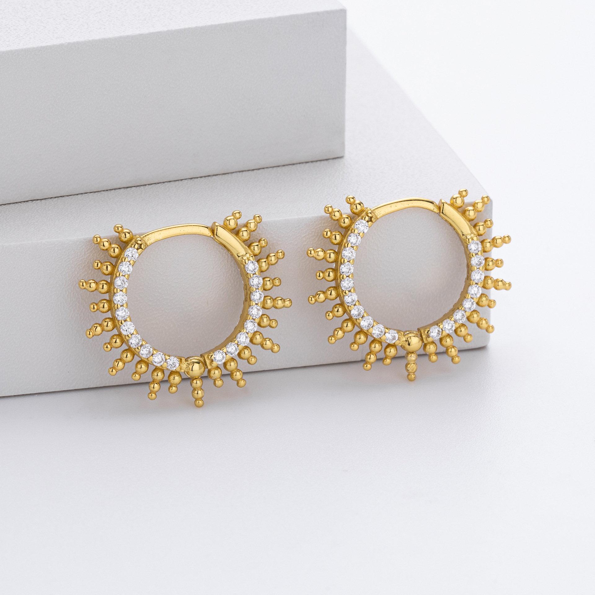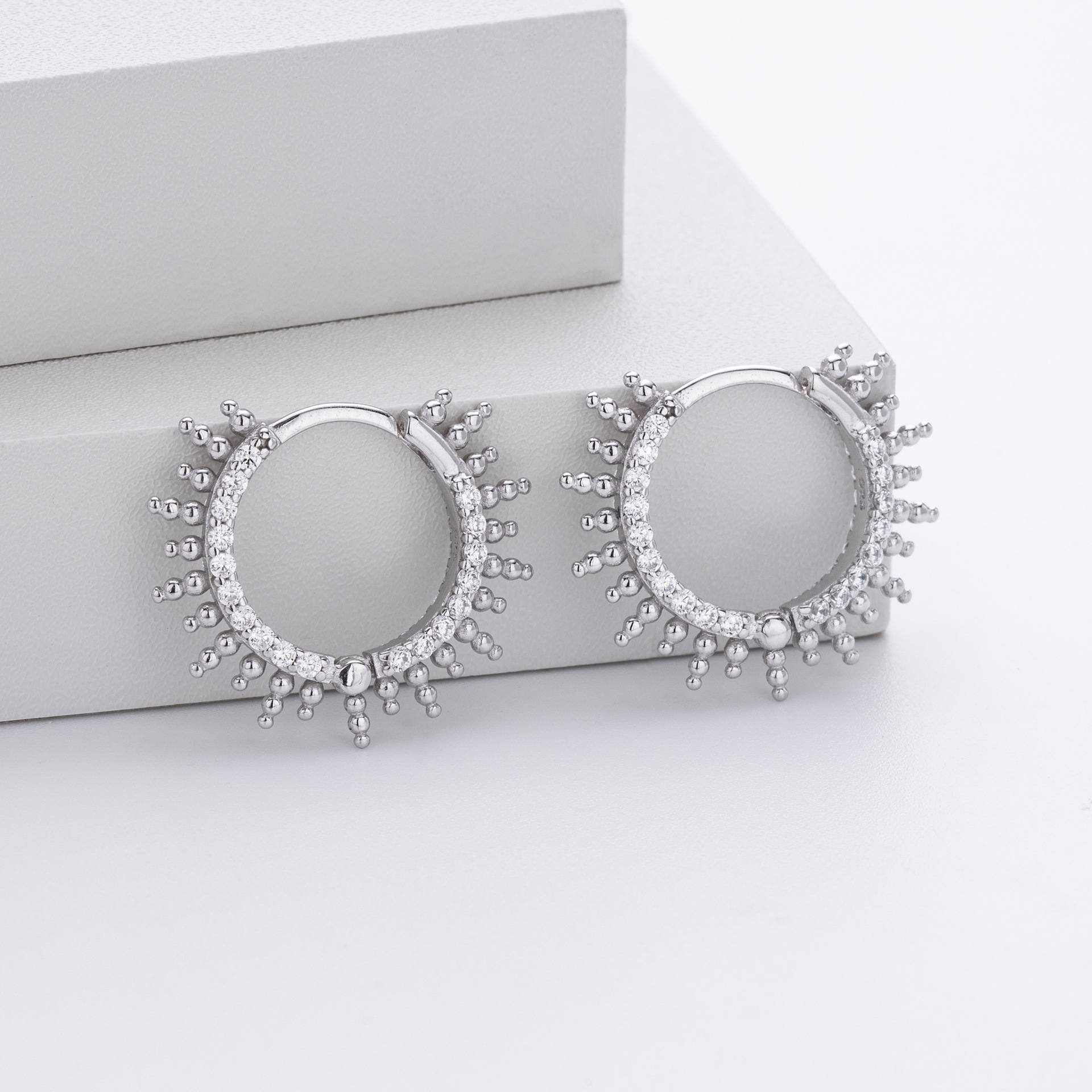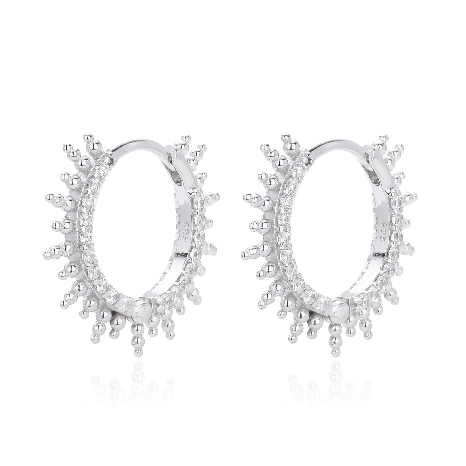 Energize your collection with our Wholesale 925 Sterling Silver Pave Sunburst Spiked Hoops. This SKU bridges the gap between "Punk Luxe" and "Celestial" trends, featuring a "Beaded Spike" or sun ray motif that adds significant visual interest to the ear profile. The combination of the "Hedgehog" style spikes and precise "Pave Setting" offers a high-complexity look that commands a higher perceived value. Manufactured from solid S925 sterling silver, these hoops are perfect for customers looking for statement pieces that remain wearable for every day.