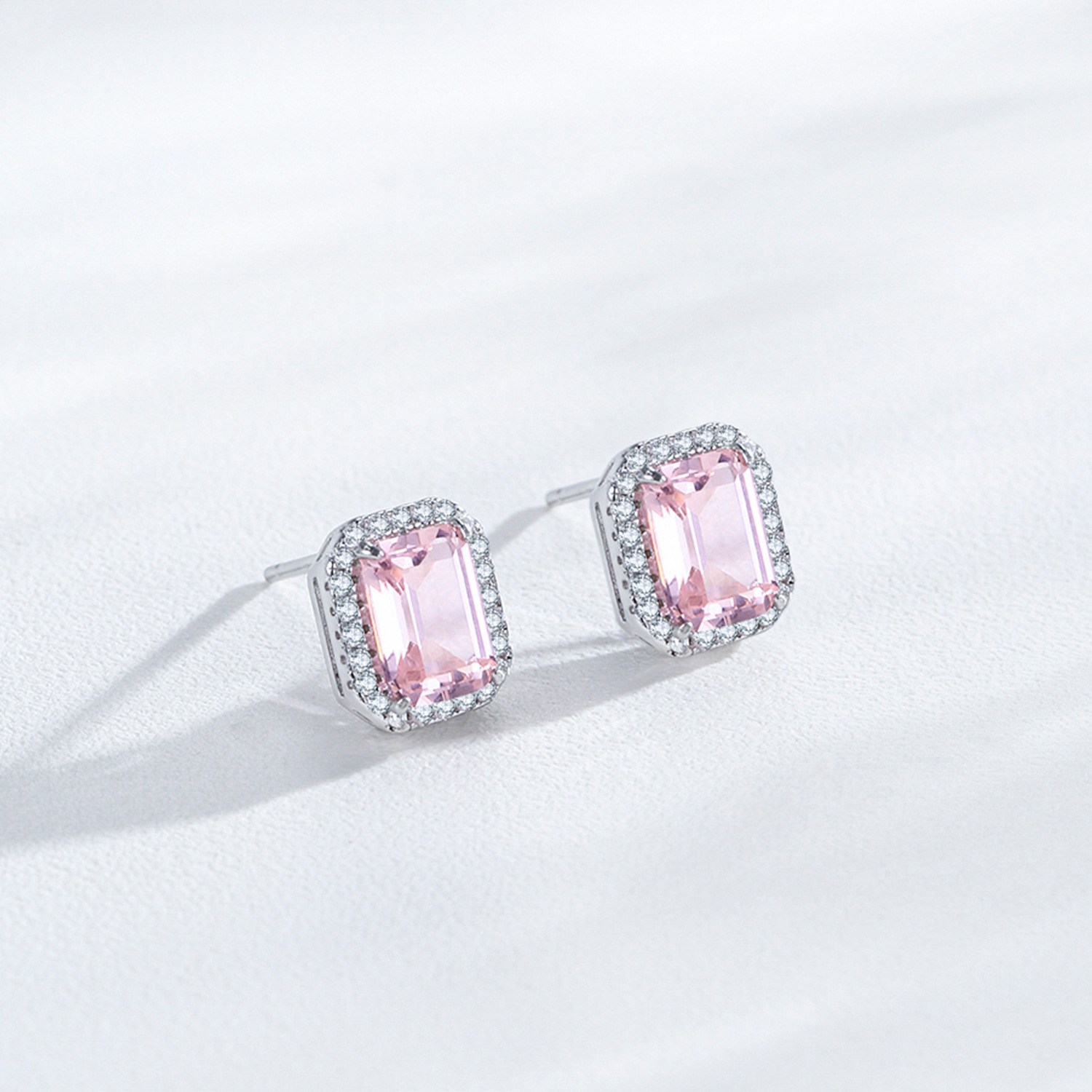 These 925 sterling silver stud earrings feature stunning pink emerald-cut zircons surrounded by a halo of brilliant micro-paved stones. The refined rectangular silhouette captures timeless glamour and femininity, making them the perfect choice for special occasions or daily sophistication. The soft blush tone adds warmth and romance, pairing effortlessly with both modern and classic styles. A must-have for those who appreciate delicate sparkle and elegant design.
