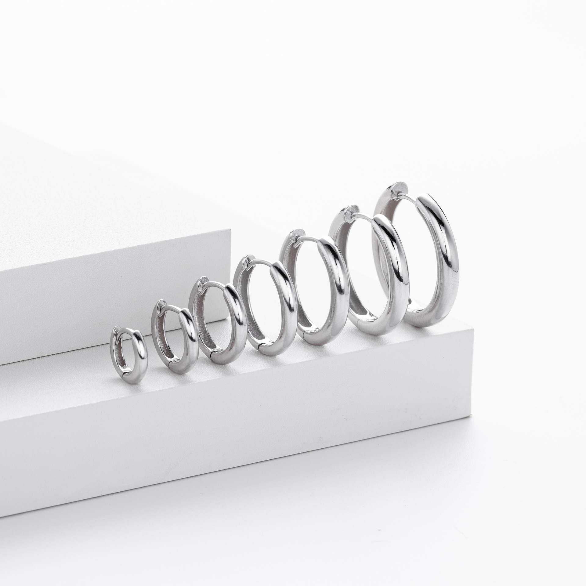 Stock the ultimate jewelry staple with our Wholesale 925 Sterling Silver Plain Polished Huggie Hoop Series. Plain hoops are a high-volume necessity for any retailer. This SKU offers a complete size run—6mm, 8mm, 10mm, 12mm, 14mm, 15mm, and 16mm—allowing you to cater to every customer's need, from tragus and helix piercings to standard lobe wear. The simple, unisex design and solid S925 sterling silver construction ensure consistent sales and low return rates.