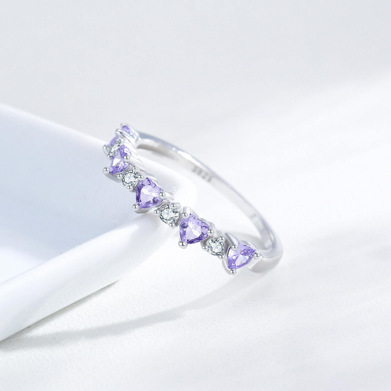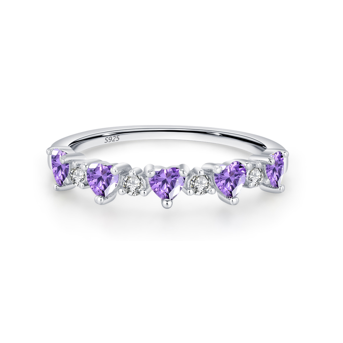 This 925 sterling silver purple heart zircon ring captures elegance and romance in every detail. Featuring alternating violet heart-shaped zircons and brilliant white accents, the design shines with a feminine and graceful allure. Crafted from genuine sterling silver, this ring is hypoallergenic, durable, and polished to a radiant finish. Perfect for daily wear, date nights, or as a heartfelt gift symbolizing love and affection.