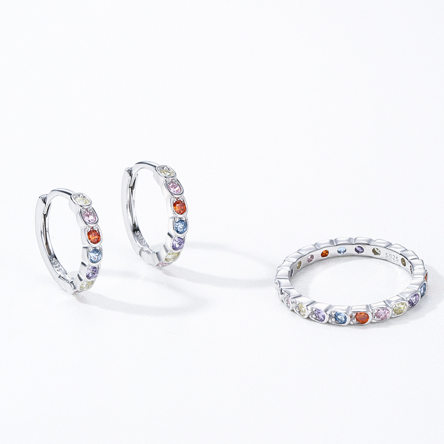 These wholesale 925 sterling silver rainbow zircon hoop earrings feature a vibrant lineup of multicolored cubic zirconia, offering a lively and youthful charm. The eye-catching color palette makes them a versatile addition to retail jewelry collections, appealing to trend-focused and fashion-loving customers. Designed for durability and shine, they’re perfect for boutiques, online stores, and seasonal promotions.