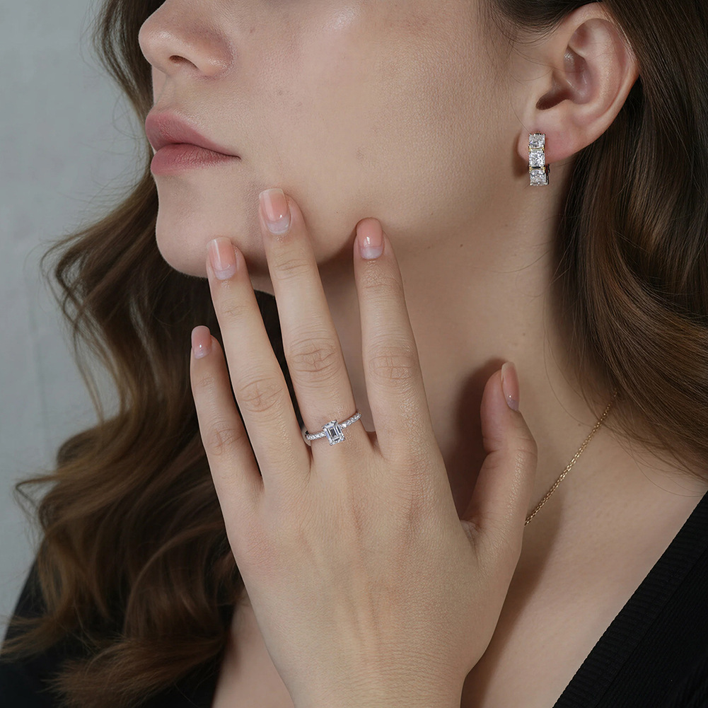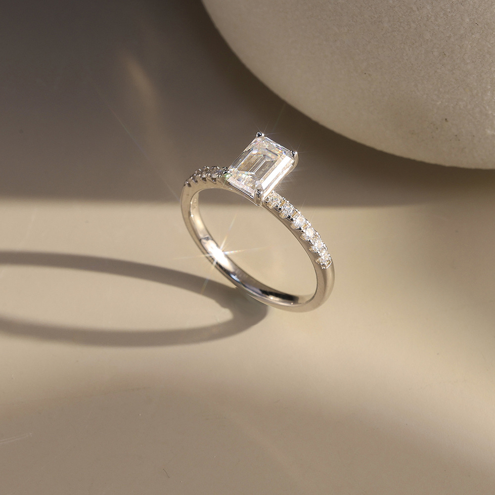 Capitalize on the soaring demand for "Fancy Shape" center stones with our Wholesale 925 Sterling Silver Rectangular Moissanite Ring. Rectangular cuts, particularly emerald and radiant shapes, are currently experiencing a massive surge in the modern bridal market. This SKU perfectly captures the trend, pairing a substantial rectangular Moissanite with a highly desired, delicate pavé shank to maximize brilliance and perceived value. Clearly stamped with S925 on the inner band, this premium piece is a highly profitable, high-turnover anchor for your "Modern Bridal," "Art Deco," or "Alternative Engagement" assortments.