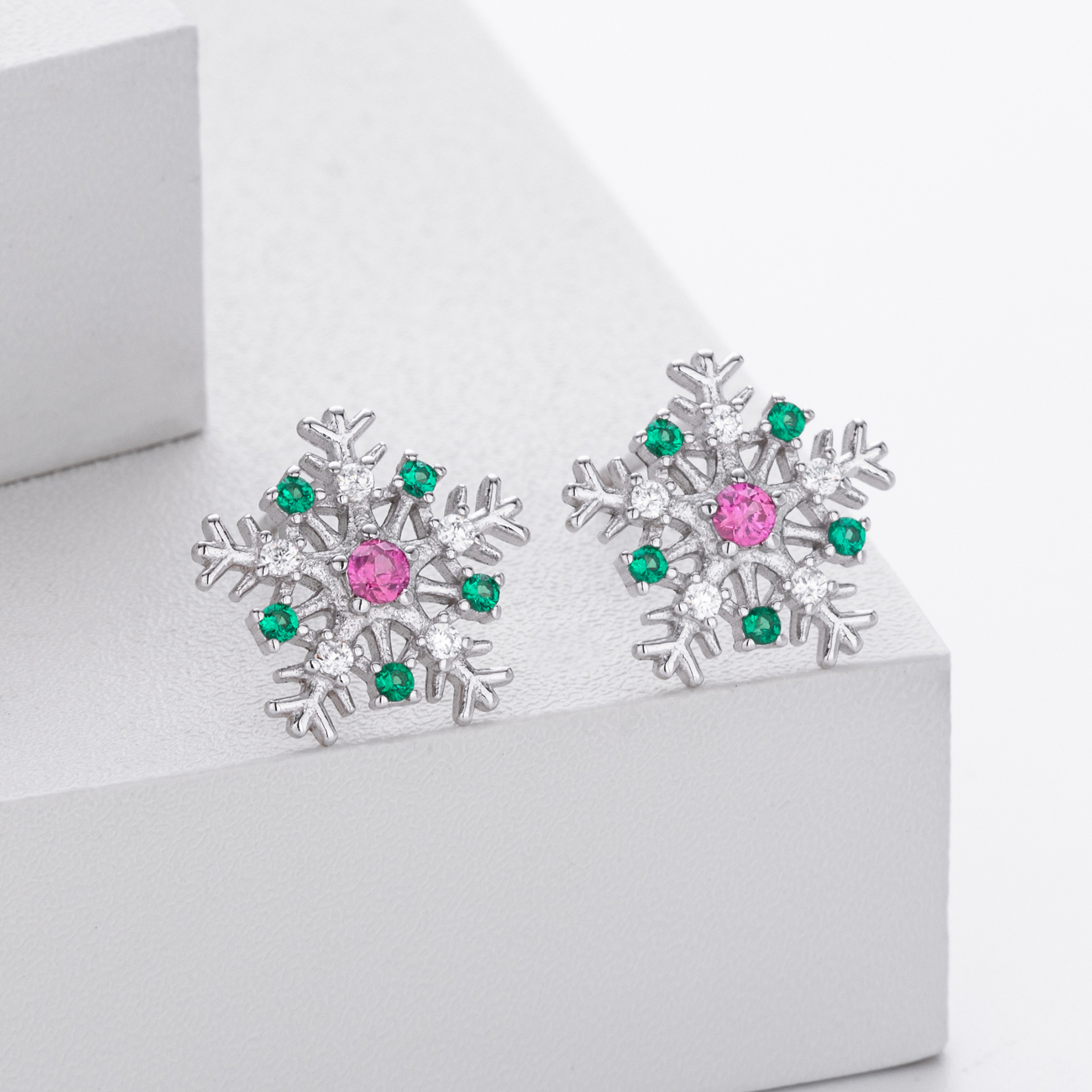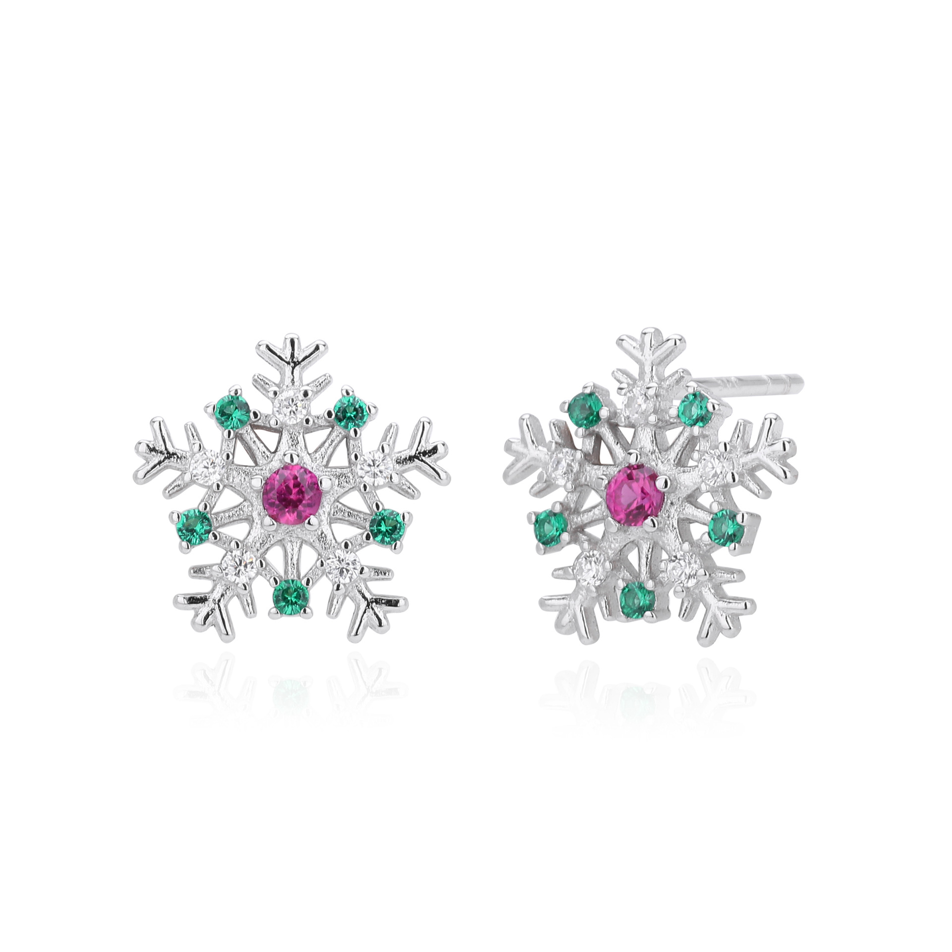 925 Sterling Silver Red Green Pave CZ Snowflake Stud Earring 40200636