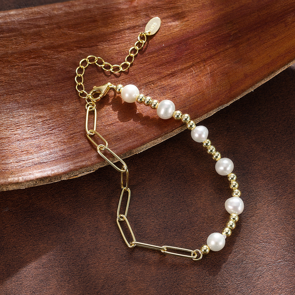 Capture the highly profitable "mixed media" and "spliced chain" trends with our Wholesale 925 Sterling Silver Spliced Paperclip Pearl Bracelet. Modern consumers are actively seeking dynamic, asymmetrical designs that disrupt traditional jewelry silhouettes, and this SKU delivers massive retail appeal by blending an edgy paperclip link chain with high-demand natural freshwater pearls and metallic spacer beads. This contrasting aesthetic looks incredibly sophisticated on the wearer, perfectly capitalizing on the lucrative "bracelet stacking" trend. Furthermore, the premium lobster clasp and included S925-stamped adjustable extender chain completely eliminate rigid sizing risks, ensuring a perfect fit for a wider demographic and drastically reducing your return rates. Available in essential silver and yellow-gold platings, this high-turnover item is an absolute necessity for your "Trendy Essentials," "Stacking Bracelets," and "Contemporary Pearl" collections.