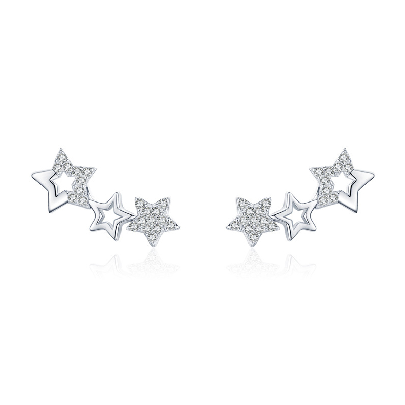These 925 sterling silver star CZ stud earrings bring a celestial charm to any jewelry collection. Featuring a cluster of open and pavé-set stars, they shimmer with high-quality cubic zirconia for a radiant finish. A customer favorite among boutiques, these earrings combine elegance and playfulness in one refined design. Each pair is crafted from genuine sterling silver with rhodium plating, offering durability, brilliance, and comfort. Perfect for wholesalers seeking trendy celestial-themed jewelry.