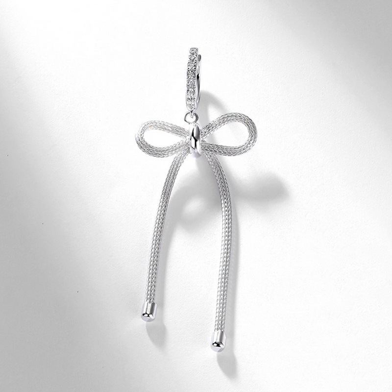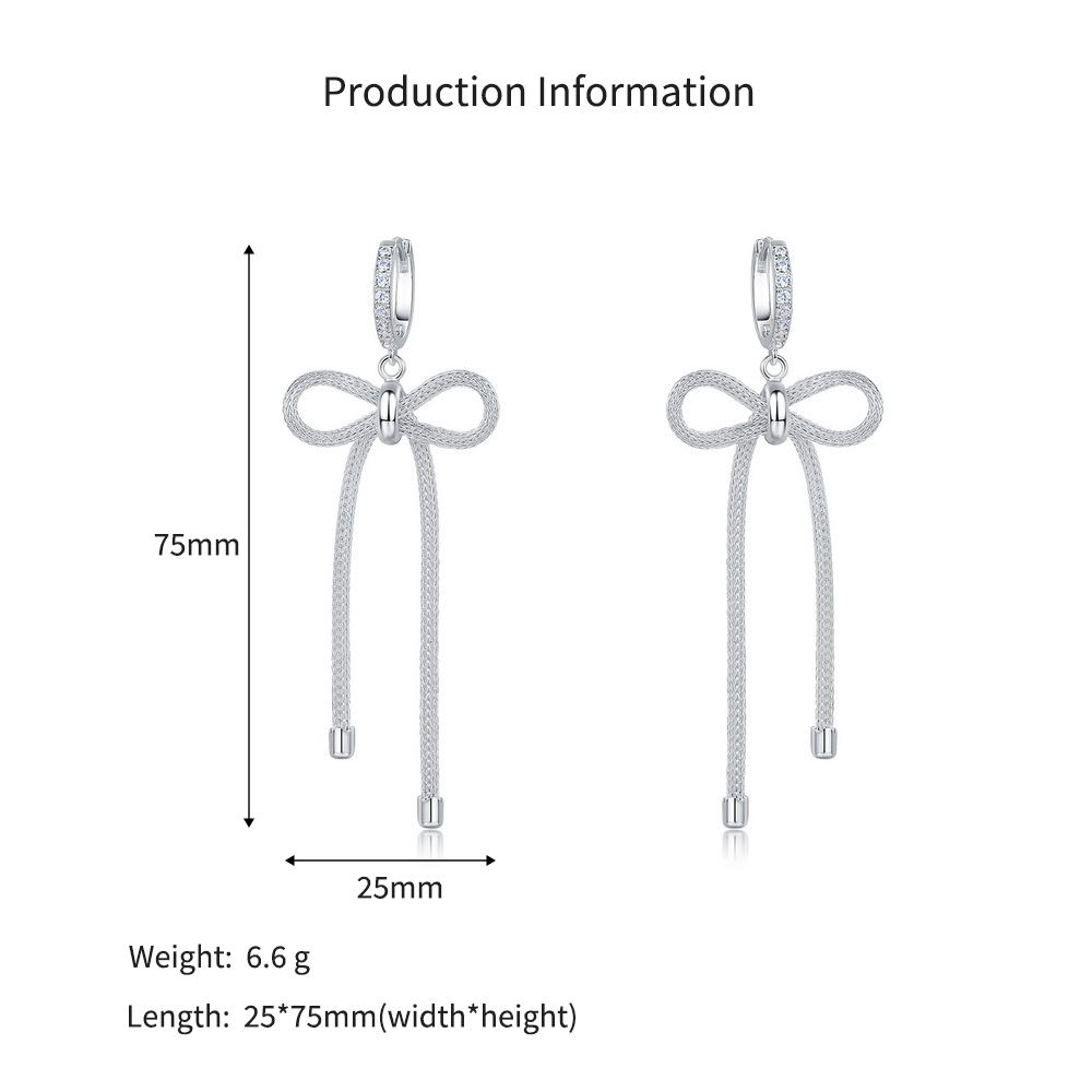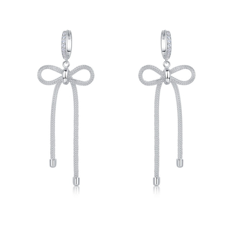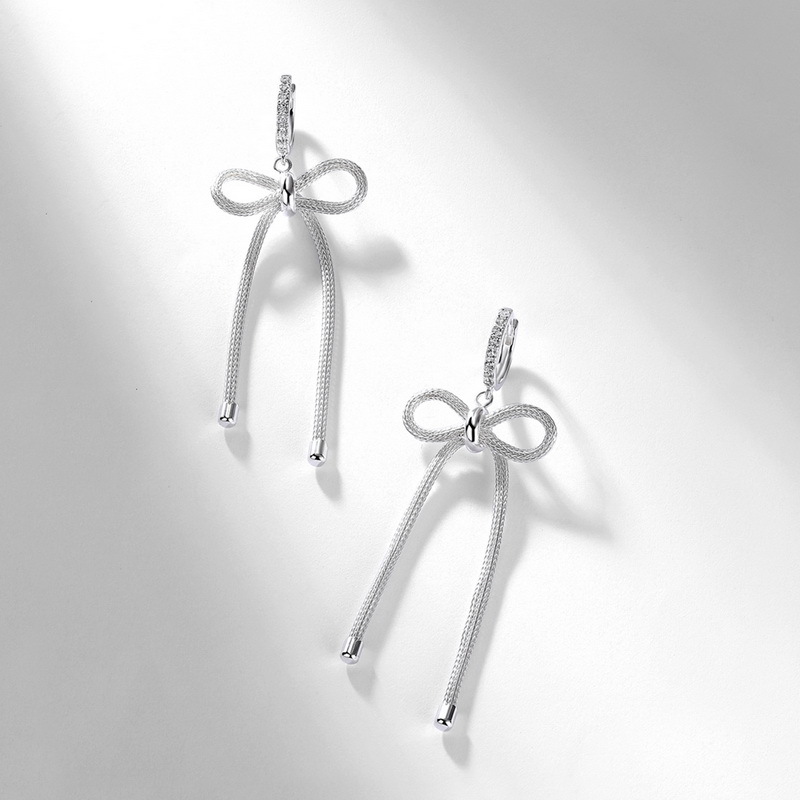 Capitalize on the explosive "coquette" and "oversized bow" fashion trends with our Wholesale 925 Sterling Silver Statement Bow Tassel Earrings. Bow motifs are currently dominating the retail market across all demographics, and this SKU executes the trend flawlessly with a high-impact, exaggerated silhouette. The design offers incredible perceived value by pairing a premium, stone-studded hoop with a beautifully textured, woven-metal bow and fluid chain tassel tails. This intricate detailing provides a high-end, designer aesthetic that supports excellent retail markups. Available in a brilliant silver finish, this highly photogenic and dynamic statement piece is a mandatory anchor for your "Evening Glamour," "Trendy Coquette," and "Statement Earring" assortments.