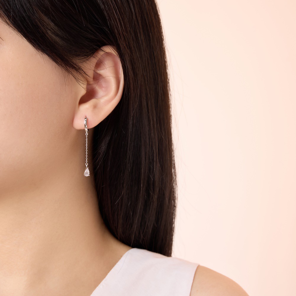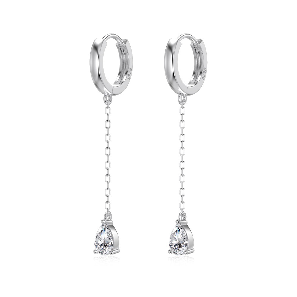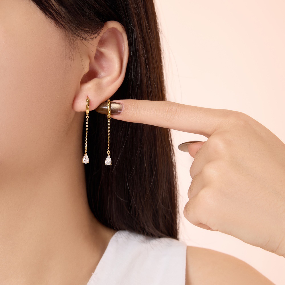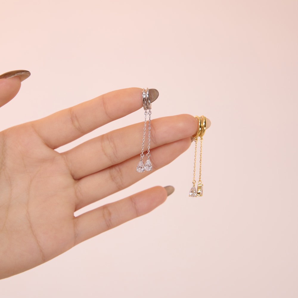 Capitalize on the massive "ear stacking" and kinetic jewelry trends with our Wholesale 925 Silver Teardrop Chain Drop Huggie Hoops. Dangle huggies are incredibly strong retail drivers that appeal to a wide demographic. This highly commercial SKU features a classic polished hoop suspending a delicate chain and a brilliant, three-prong set teardrop crystal. Available in highly requested silver and gold finishes, these hypoallergenic S925 earrings deliver exceptional movement and premium boutique-level perceived value. A mandatory, fast-turning anchor for your "Everyday Luxury" and "Modern Edge" collections.