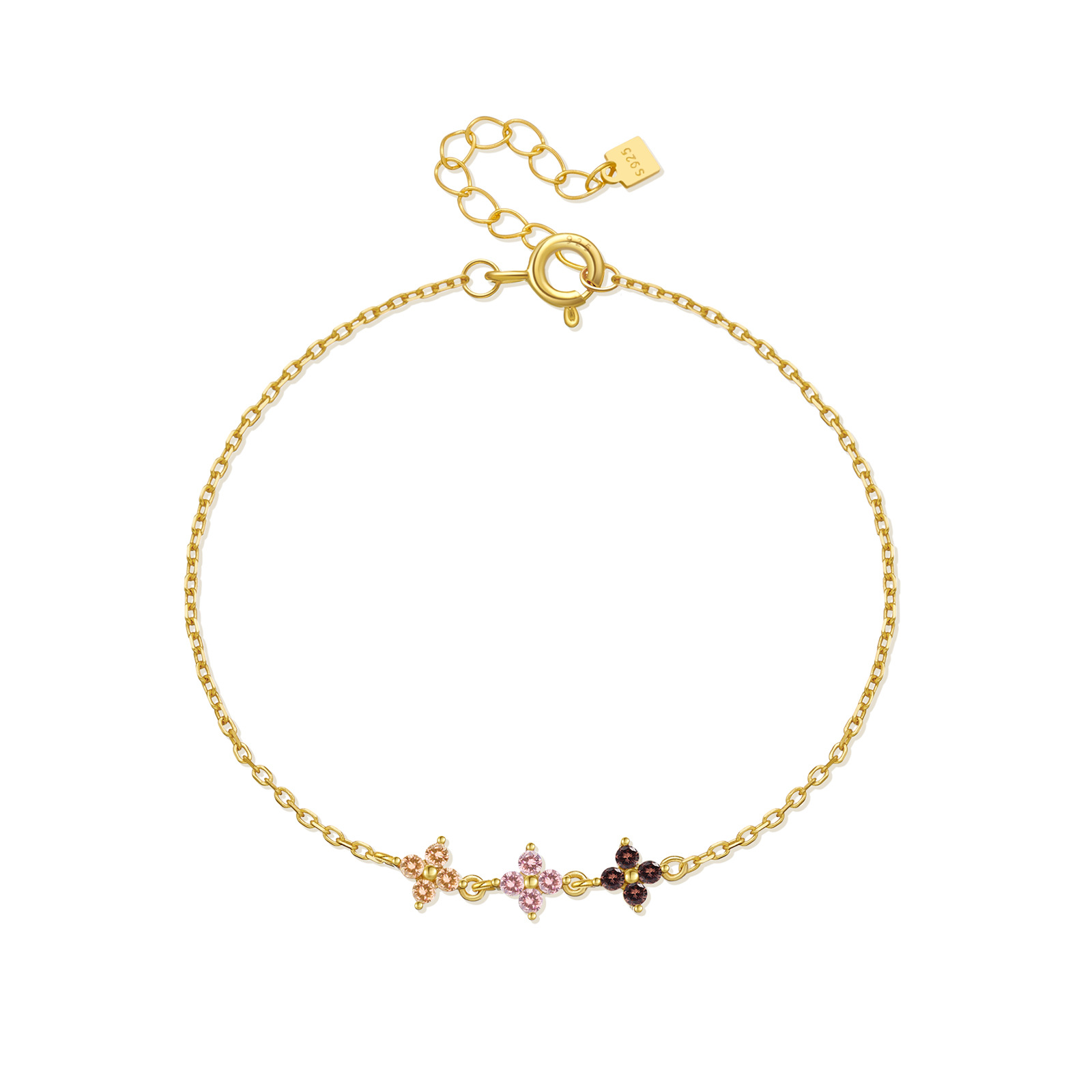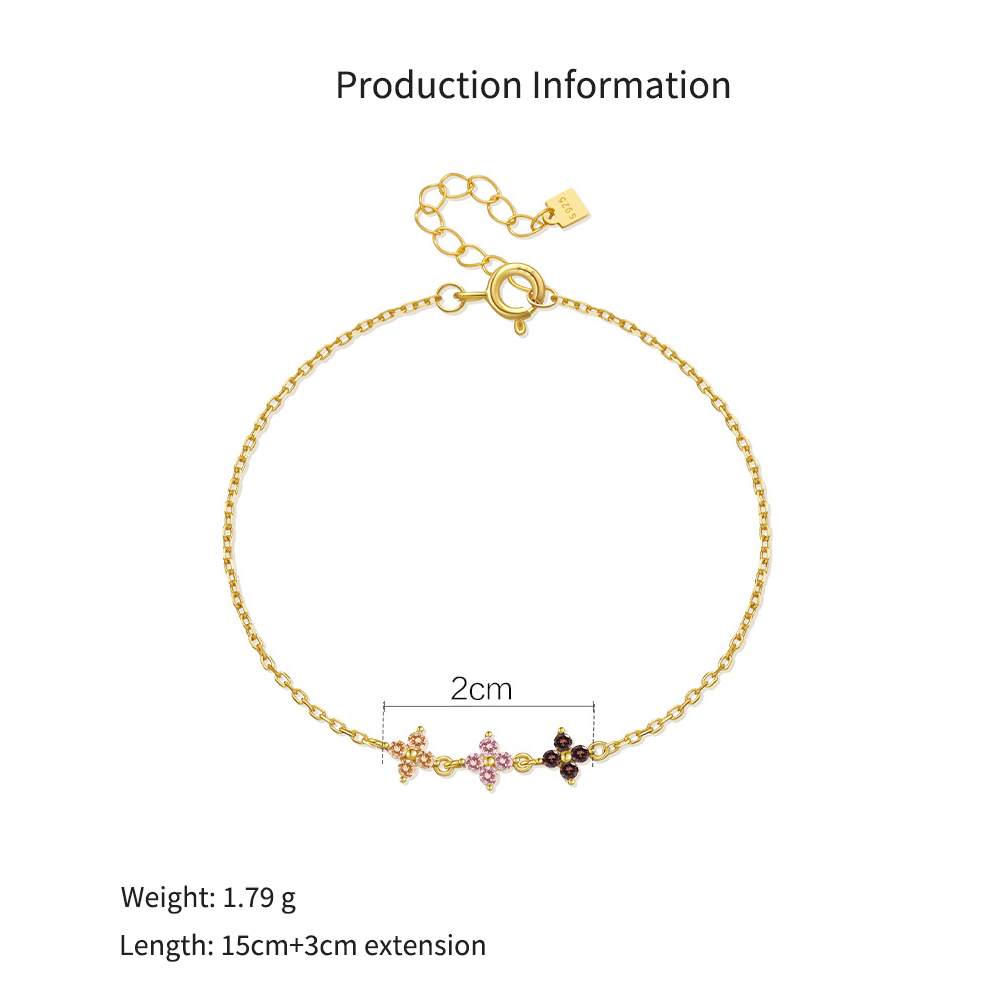Capitalize on the perennial popularity of botanical jewelry with our Wholesale 925 Sterling Silver Tri-Color Floral Chain Bracelet. Dainty, minimalist chains featuring subtle pops of color are highly requested staples in the everyday fine jewelry market. This specific SKU delivers a premium boutique aesthetic by showcasing three distinct, multi-colored flower motifs—in highly commercial shades of champagne, pink, and deep burgundy—clustered seamlessly at the center of a delicate gold-finished chain. Furthermore, the inclusion of a highly practical adjustable extender chain provides significant logistical value by minimizing customer sizing issues and reducing return rates. Crafted from hypoallergenic S925 silver, this piece is a mandatory high-margin anchor for your "Everyday Staples," "Romantic Florals," and "Layering Bracelets" assortments.