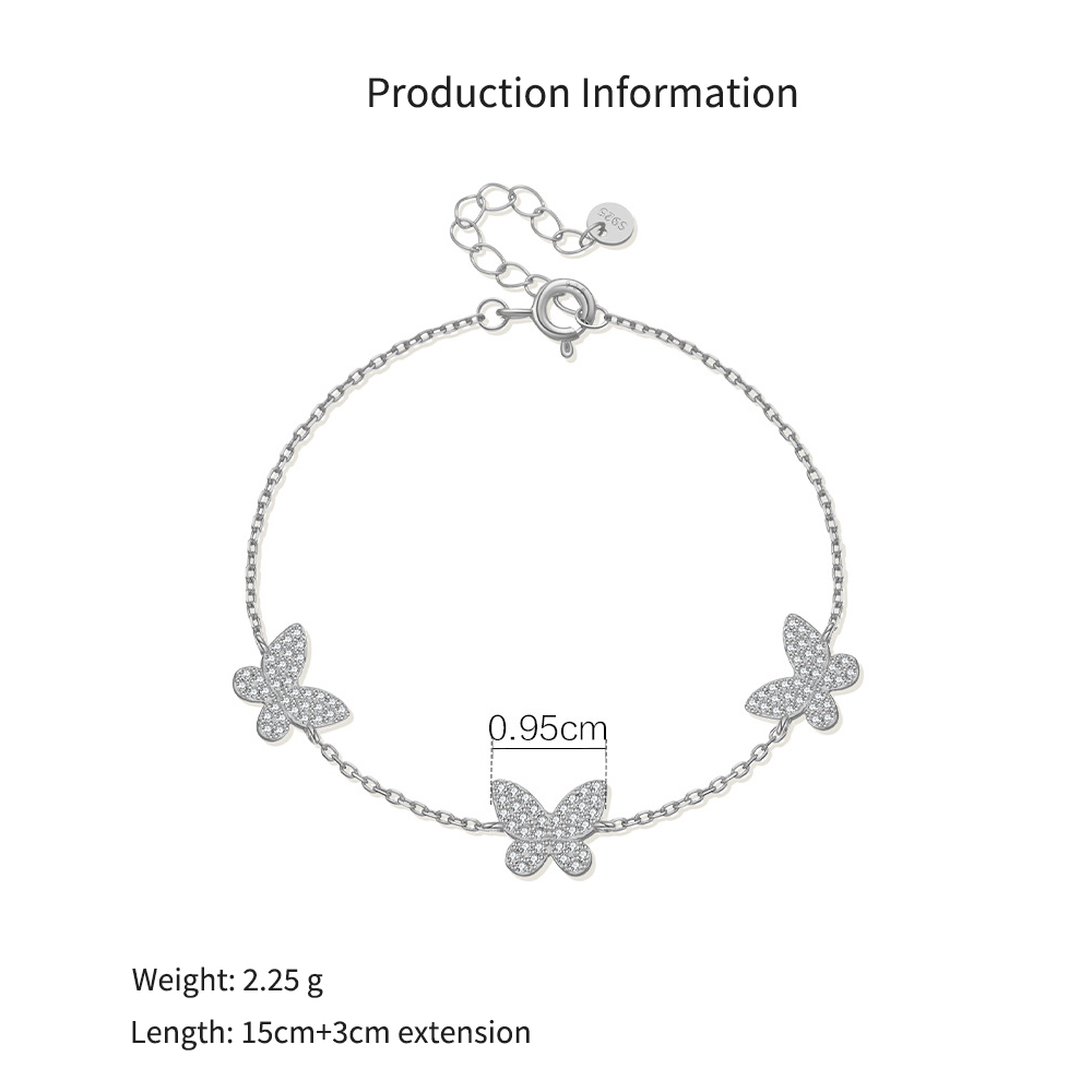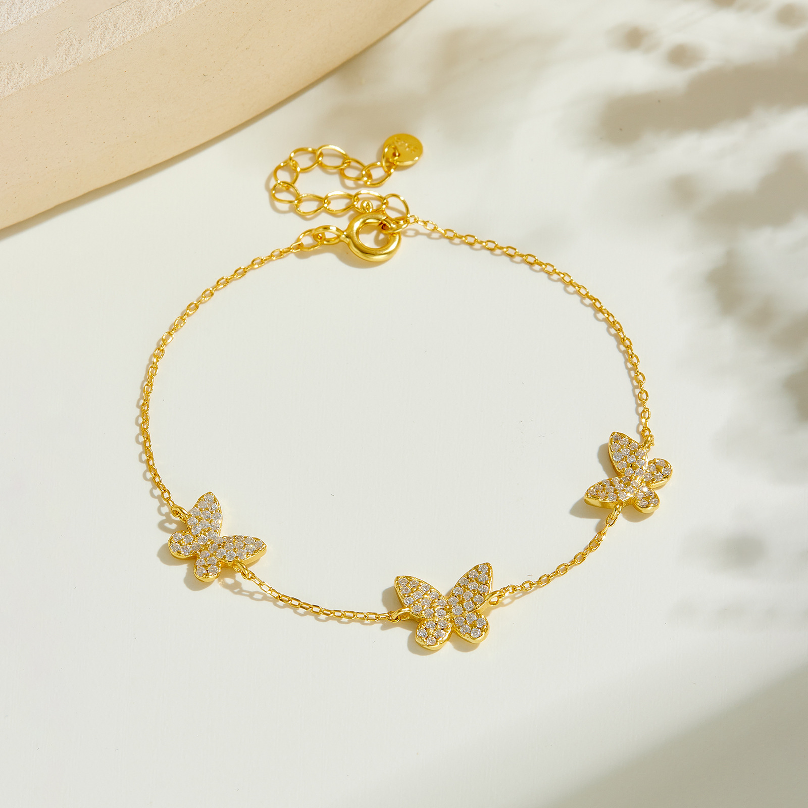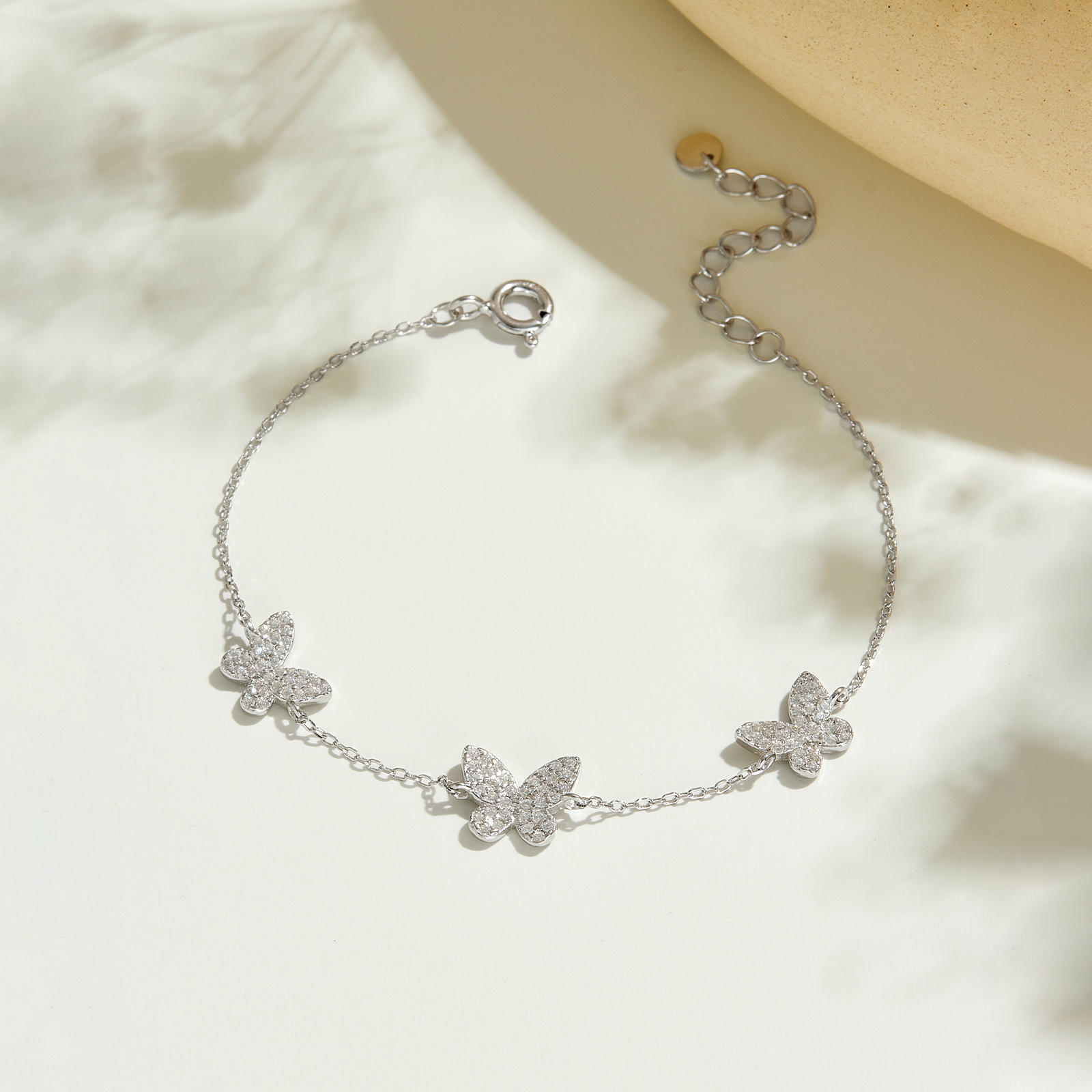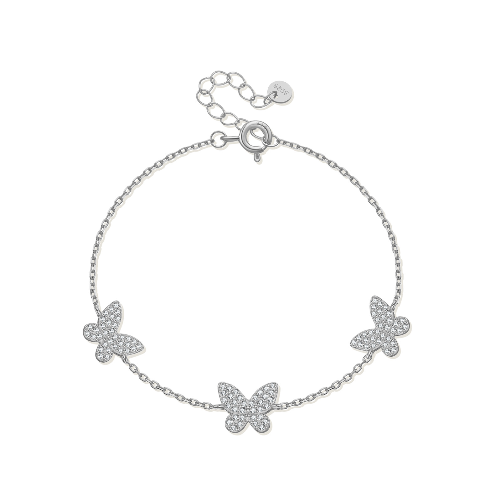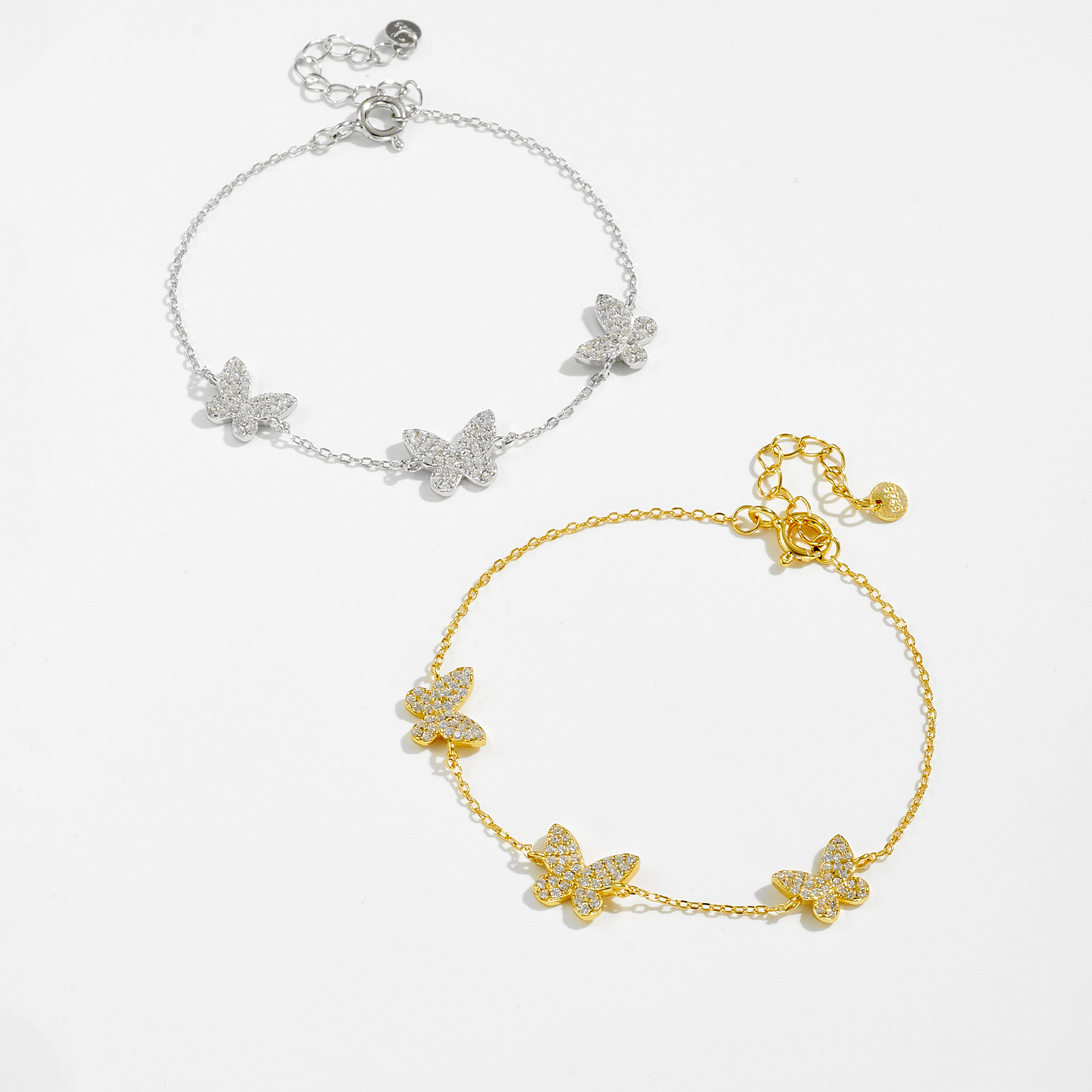Drive consistent, high-volume sales in your "everyday fine jewelry" category with our Wholesale 925 Sterling Silver Triple Pave Butterfly Bracelet. Animal and nature motifs—especially butterflies, which symbolize transformation and grace—are evergreen, highly commercial silhouettes with massive appeal in both self-purchase and gifting markets. This SKU executes the trend flawlessly with three intricately pave-set butterfly charms spaced evenly along a premium, dainty chain. The design includes a highly practical adjustable extender chain, which provides significant logistical value by minimizing customer sizing issues. By offering this boutique-quality aesthetic in both gold and silver finishes, you encourage multiple purchases and build a robust, high-margin inventory anchor for your "Feminine Romance," "Meaningful Gifts," and "Everyday Staples" assortments.