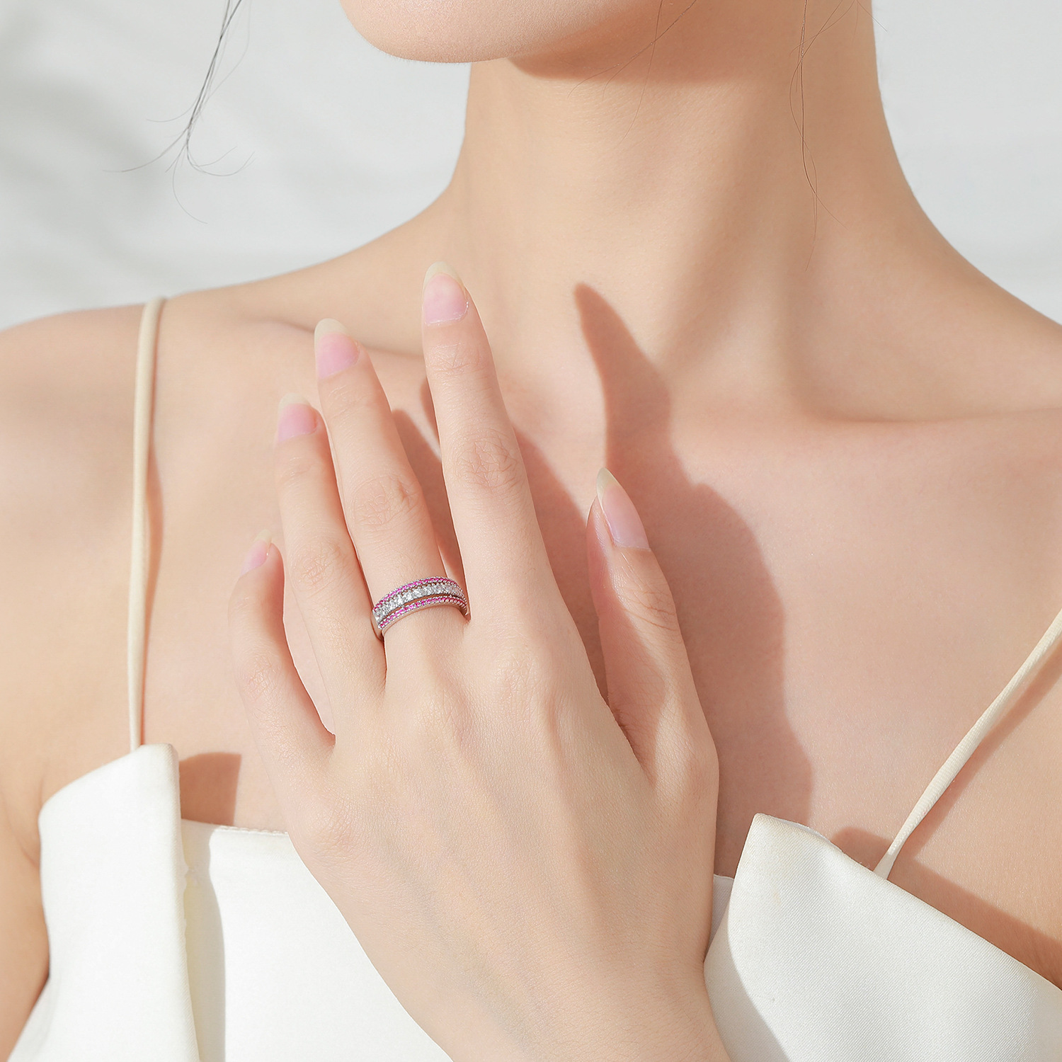 These wholesale 925 sterling silver triple-row zircon rings feature stunning micro-pavé craftsmanship with a colored center row in either pink or blue. Each piece is crafted from high-quality S925 silver for a lasting shine and hypoallergenic comfort. Designed to appeal to fashion-forward consumers, this ring is ideal for jewelry boutiques, online shops, and gift retailers. The classic yet modern design ensures high sales potential for collections focusing on elegance, color, and sparkle.