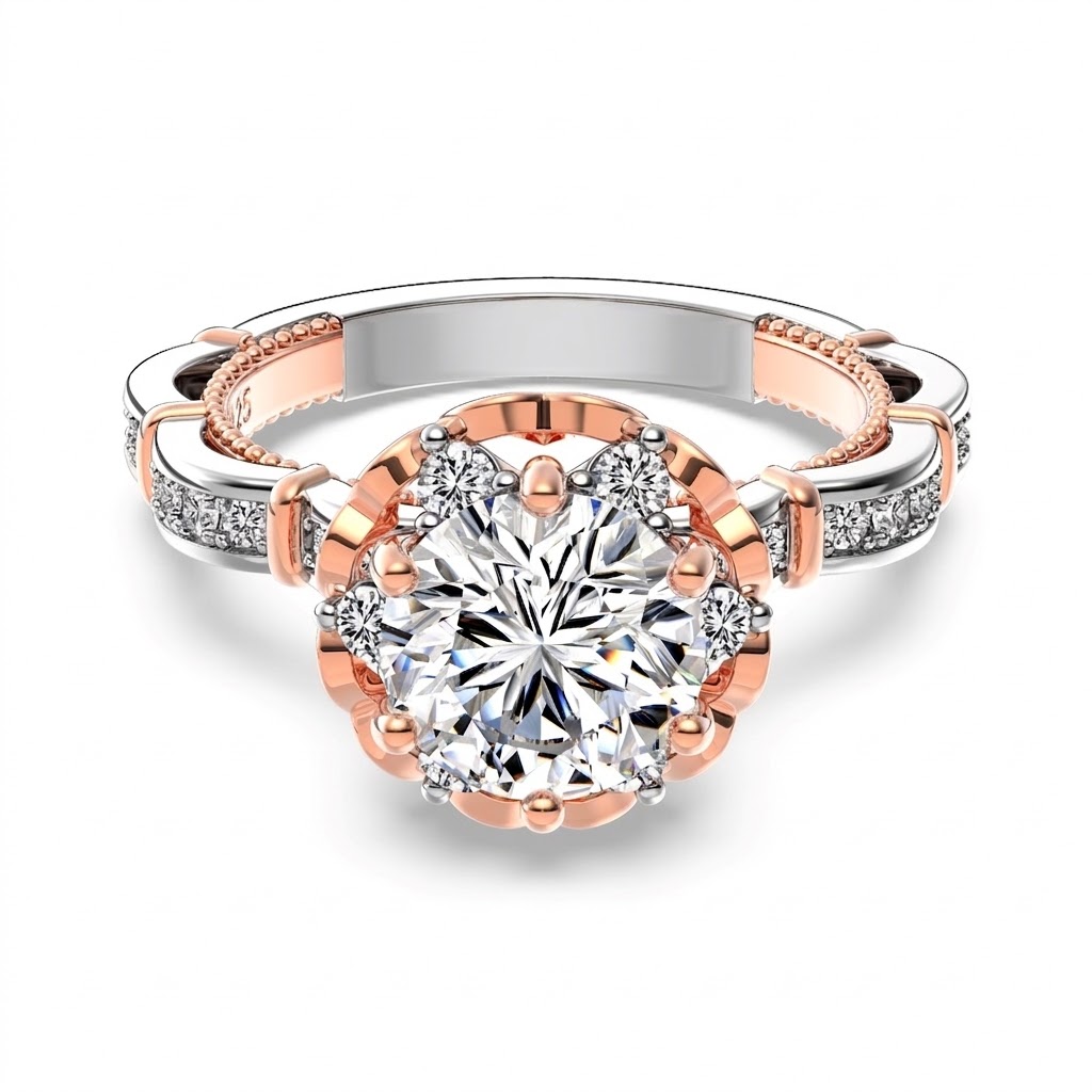 Elevate your vintage and bridal alternative collections with our wholesale-exclusive two-tone floral halo ring. Mixed-metal designs and intricate, vintage-inspired craftsmanship are highly requested retail drivers. This spectacular SKU features a brilliant 8mm round-cut center zircon nestled within a scalloped, rose gold-plated floral halo. The luxurious detailing continues down the band with clear micro-pave accents and contrasting rose gold milgrain borders. Crafted from hypoallergenic S925 sterling silver, this heavy-crafted ring delivers exceptional boutique-level perceived value and a bespoke designer aesthetic. A mandatory, high-margin anchor for your premium bridal, romantic gifting, and luxury statement jewelry assortments.