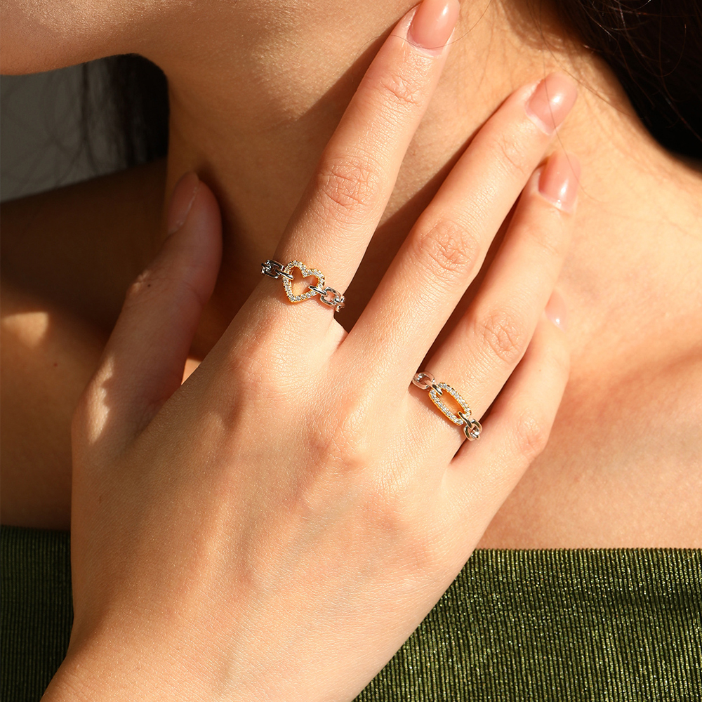 Maximize your cross-selling potential and capitalize on the booming "mixed-metal" trend with our Wholesale 925 Sterling Silver Two-Tone Geometric Chain Ring. "Paperclip" and geometric chain links are dominating the contemporary jewelry market, and this SKU flawlessly executes the look with a trendy silver interlocking band anchored by a contrasting, gold-finished elongated link. The gold link is meticulously paved with high-sparkle accent stones, offering a premium boutique texture that justifies excellent retail markups. As the perfect sister piece to our heart chain ring, this versatile design encourages customers to purchase multiple styles to build their custom ring stacks. Crafted from hypoallergenic S925 silver, this high-turnover item is a mandatory anchor for your "Modern Link," "Mixed Metals," and "Everyday Stacking" assortments.