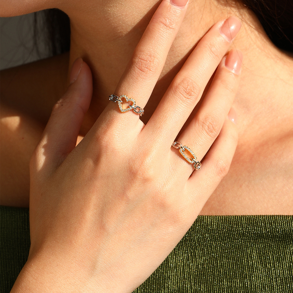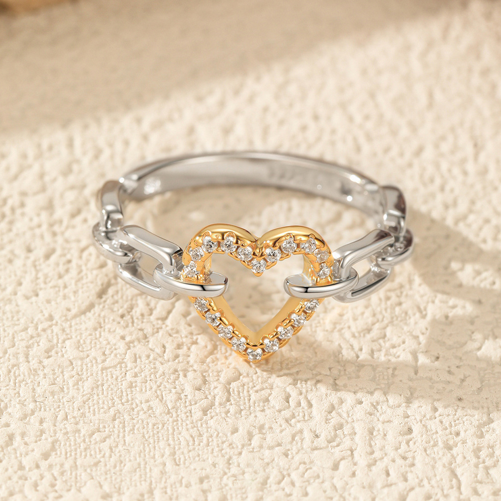 Capitalize on the massive "mixed-metal" jewelry trend with our Wholesale 925 Sterling Silver Two-Tone Pave Heart Chain Ring. Modern consumers are increasingly seeking versatile pieces that seamlessly bridge the gap between their existing gold and silver collections. This SKU flawlessly answers that demand with a trendy, silver interlocking chain-link band anchored by a contrasting, gold-finished open heart. The heart is beautifully paved with high-sparkle accent stones, adding a premium, boutique-quality texture that easily justifies excellent retail markups. Looking modern and chic on the hand, this versatile design is a phenomenal up-selling item that encourages customers to build their ring stacks. Crafted from hypoallergenic S925 silver, this high-margin piece is a mandatory anchor for your "Contemporary Romance," "Mixed Metals," and "Everyday Stacking" assortments.