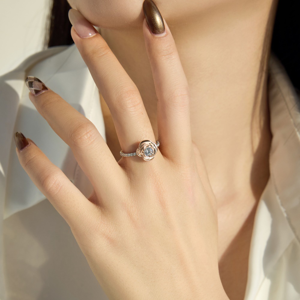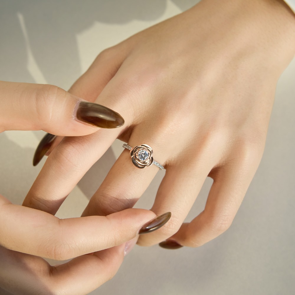 Capitalize on the highly profitable romantic gifting market with our wholesale-exclusive two-tone rose flower ring. Floral motifs combined with mixed-metal aesthetics are massive retail drivers. This exceptional SKU features a brilliant round-cut center zircon securely nestled within a highly detailed, rose gold-plated 3D blooming rose. The statement centerpiece rests on a silver-tone band accented with clear micro-pave crystals. Crafted from hypoallergenic S925 sterling silver, it delivers incredible fine-jewelry-level craftsmanship and an enchanting appeal that customers instantly connect with. A mandatory, high-margin anchor for your promise ring, alternative bridal, and romantic gifting assortments.