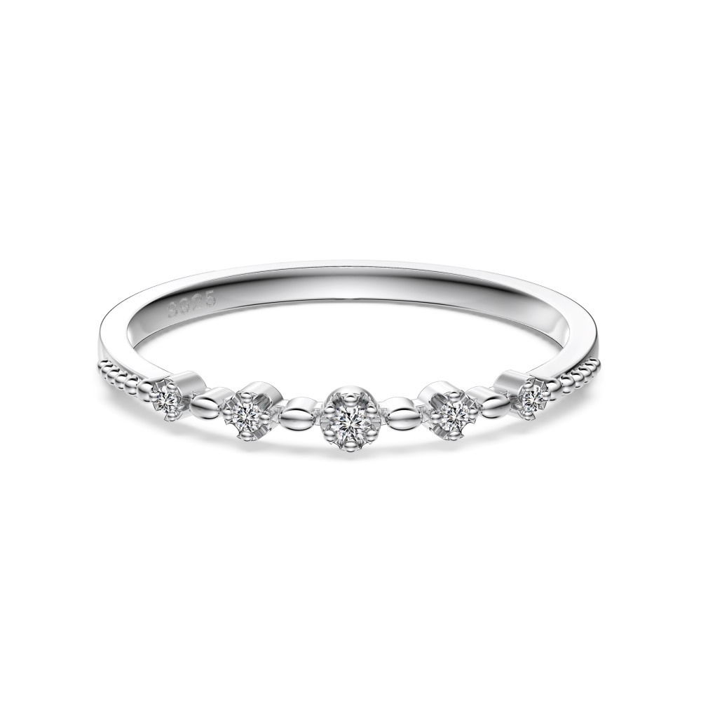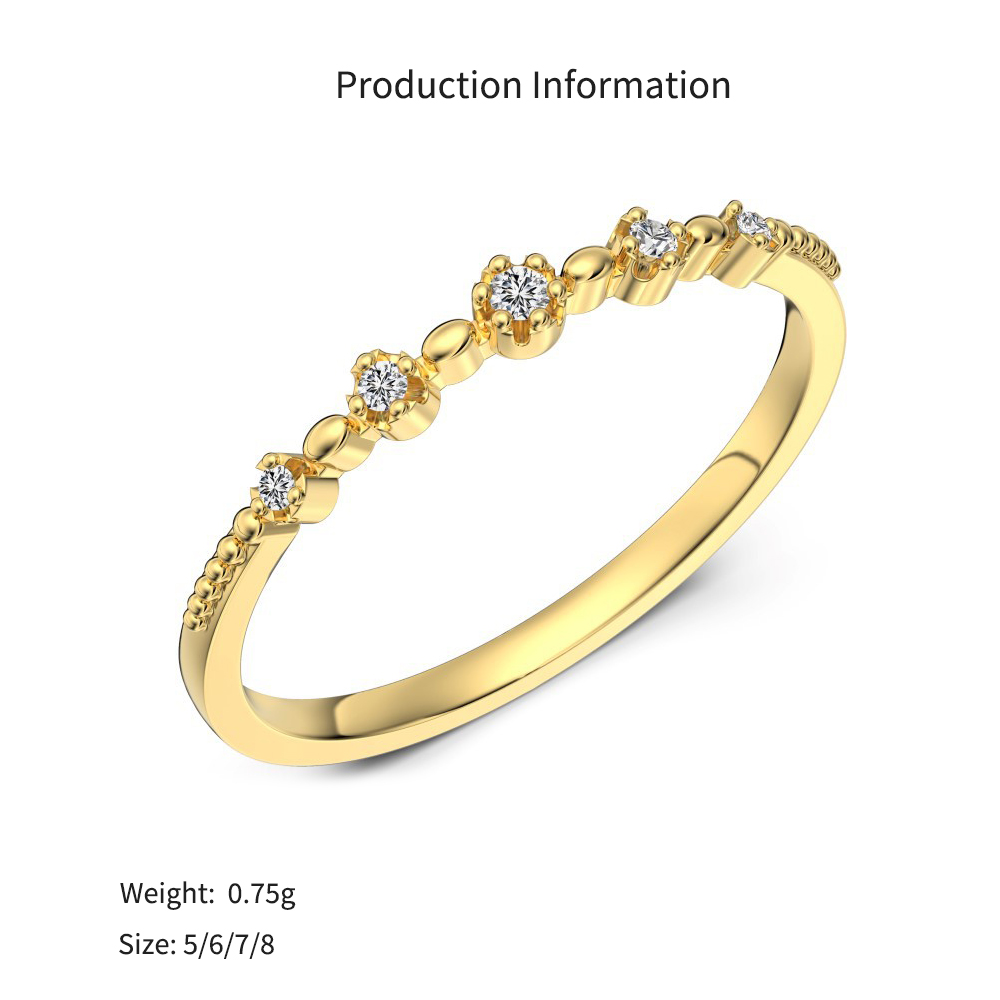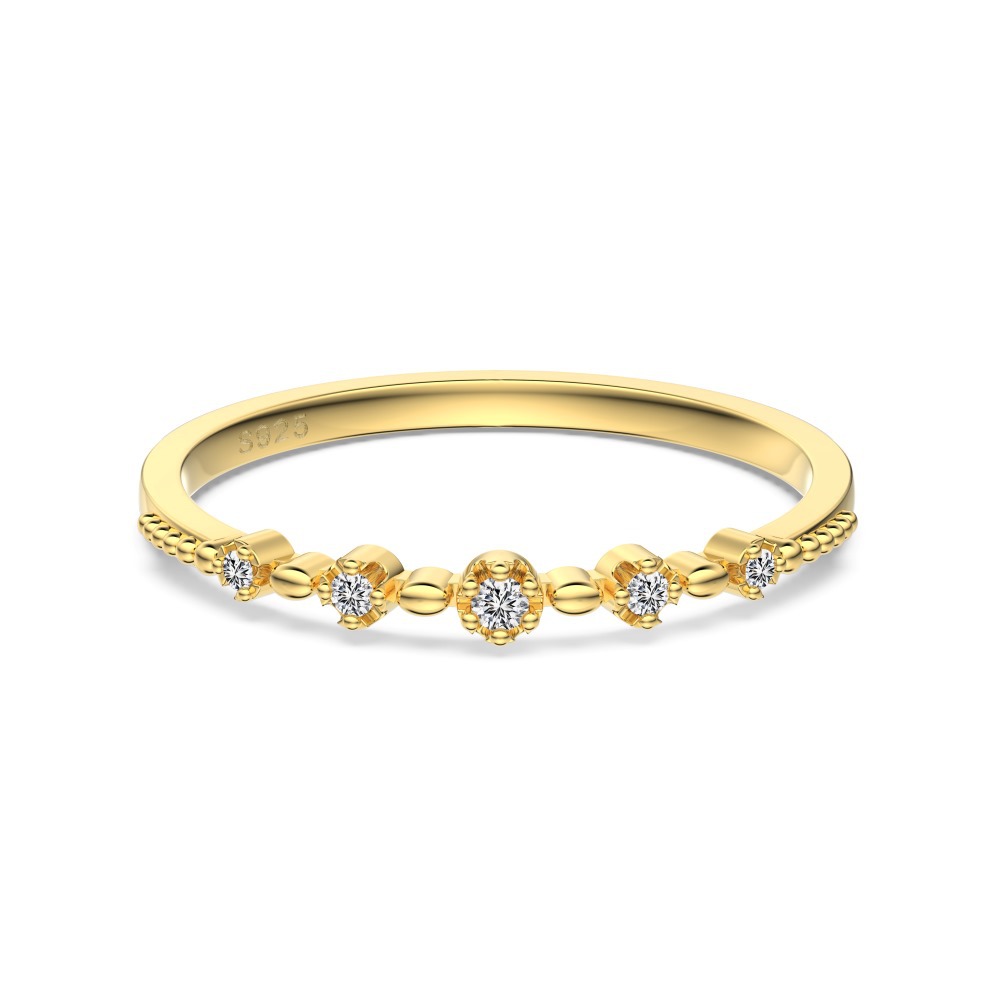 Capitalize on the thriving vintage and delicate ring-stacking trends with our wholesale-exclusive vintage lace band. Thin, textured bands are essential retail drivers that consistently encourage customers to purchase multiple units for layering. This highly commercial SKU features five brilliant round-cut zircons secured in intricate milgrain bezels, perfectly connected by delicate polished beads to create a romantic, textured aesthetic. Crafted from hypoallergenic S925 sterling silver and available in popular gold and silver finishes, it delivers exceptional boutique-level craftsmanship. A fast-turning, high-margin anchor for your everyday luxury, romantic gifting, and contemporary stacking jewelry assortments designed to drive high-volume sales.