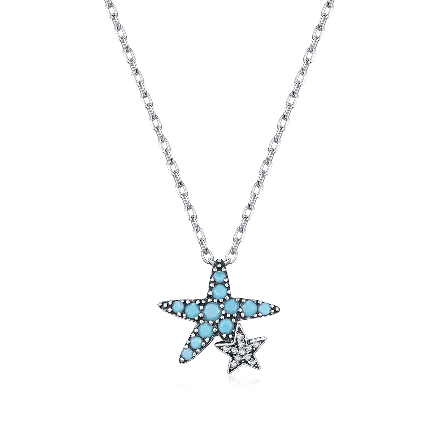 Capitalize on the ever-lucrative resort wear and boho-chic markets with our Wholesale 925 Sterling Silver Vintage Turquoise Starfish Necklace. Nautical motifs are guaranteed high-volume sellers, and this SKU elevates the standard coastal aesthetic by utilizing vibrant synthetic turquoise stones paired with a highly sought-after oxidized ("vintage") silver finish. This intentionally distressed detailing creates a premium, artisanal boutique look that supports excellent retail markups. The asymmetrical double-starfish design—featuring one turquoise star and one clear crystal star—adds significant visual interest and a high-end designer appeal. Styled perfectly at the collarbone, this hypoallergenic S925 piece is a mandatory anchor for your "Summer Resort," "Boho Coastal," and "Vacation Essentials" collections.